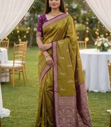 Olive green soft silk blend saree with zari weaving meenakari design