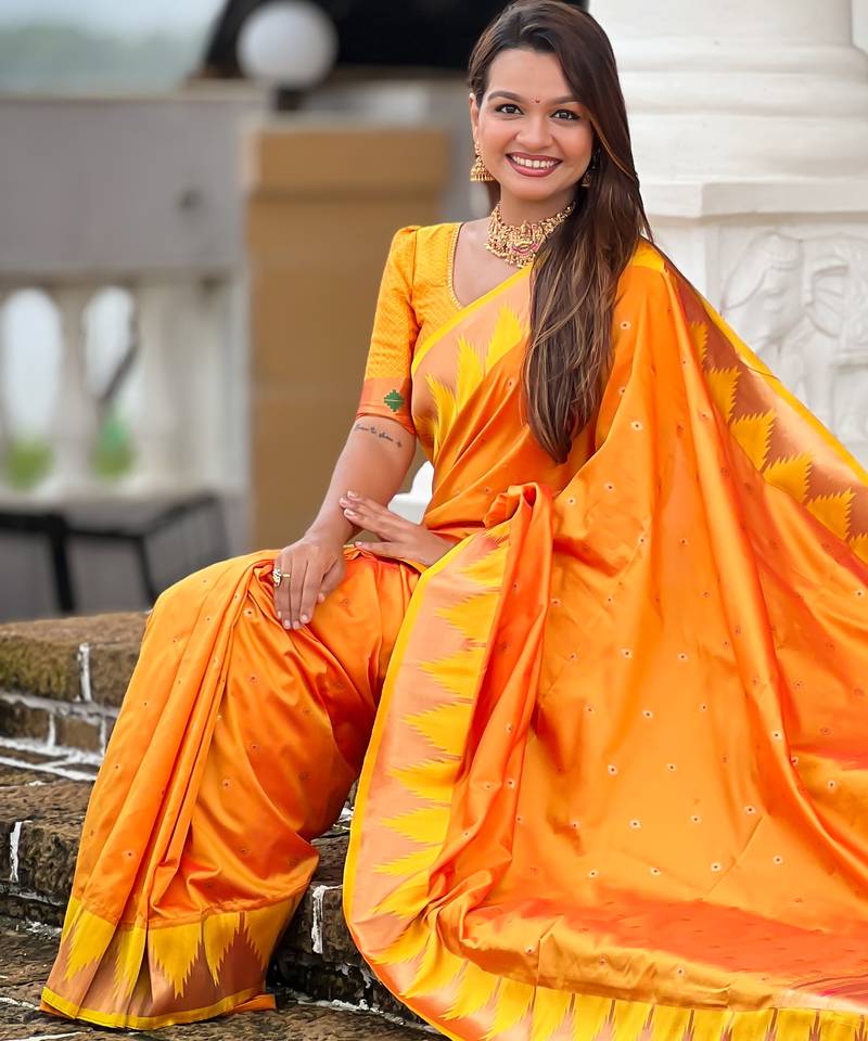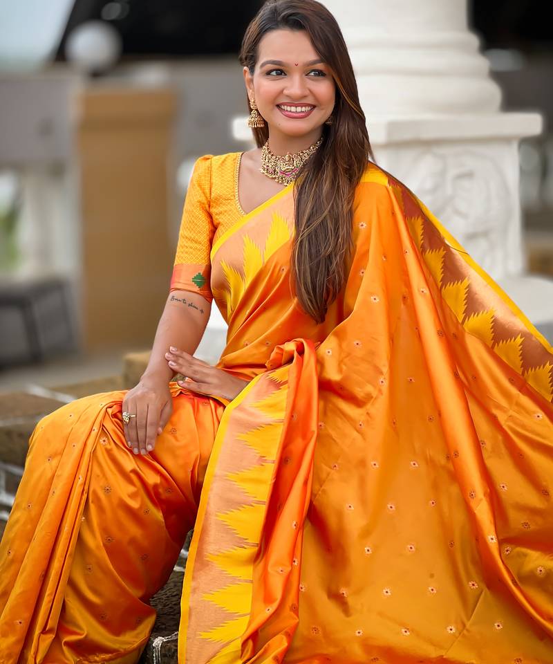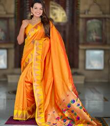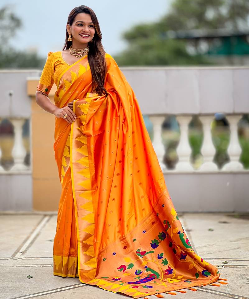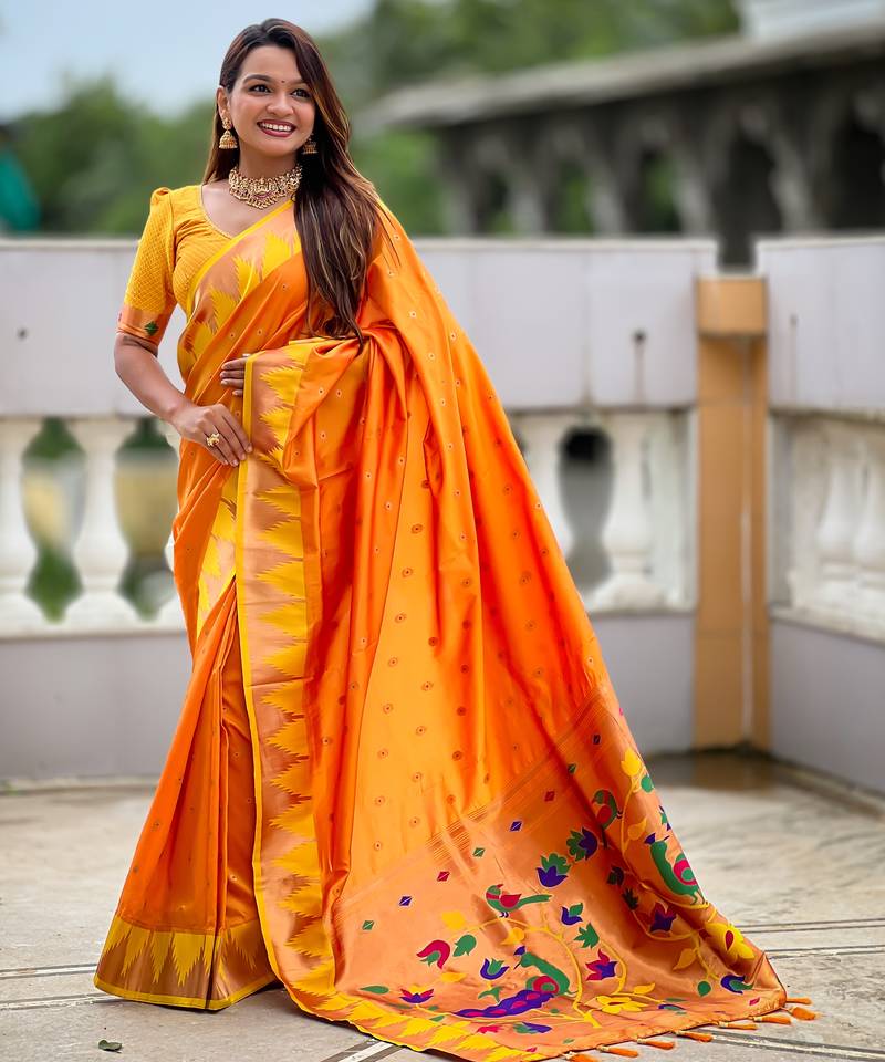 Orange color faux banarasi silk saree with paithani rich weaved pallu and blouse