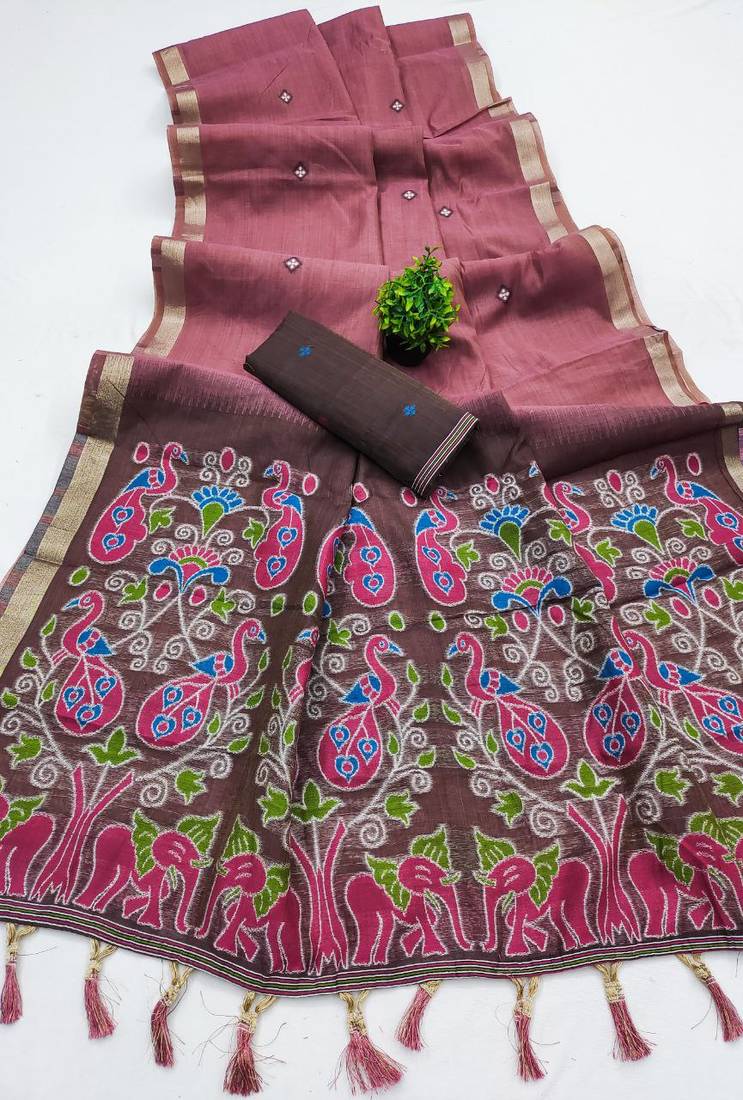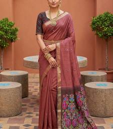 Pink soft pure muga cotton saree with meenakari weaving motifs and contrast blouse