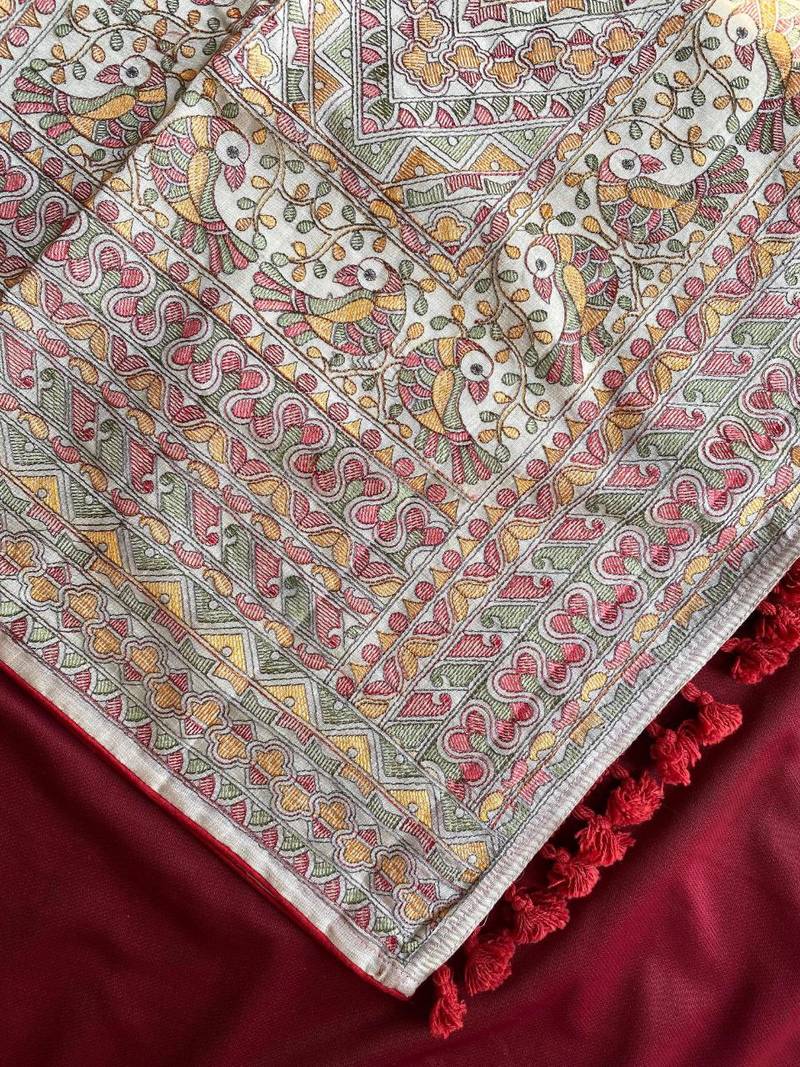 Tussar saree with all over position embroidery traditional madhubani embroidered pallu