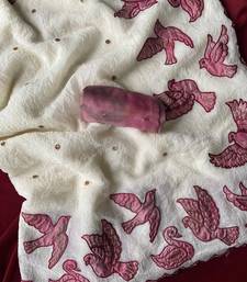 White crushed fabric saree with beautiful applique pattern panel of bird design