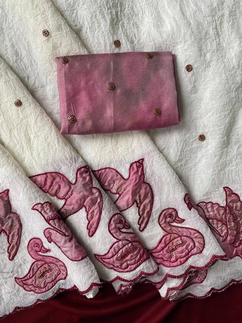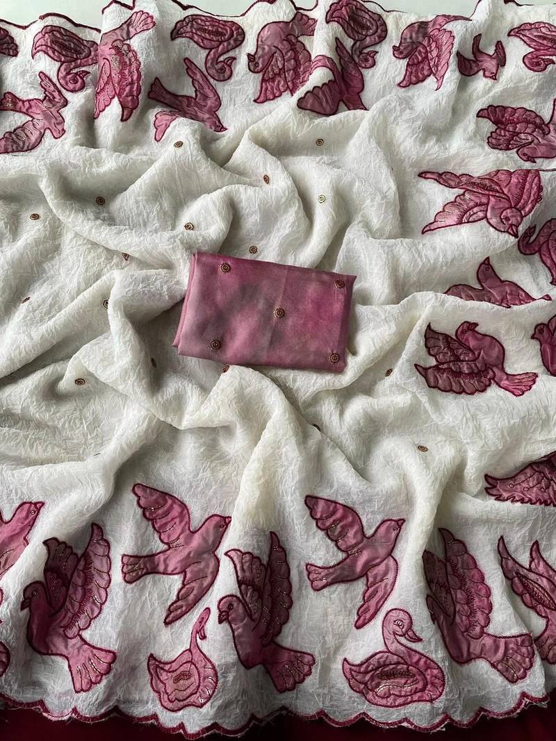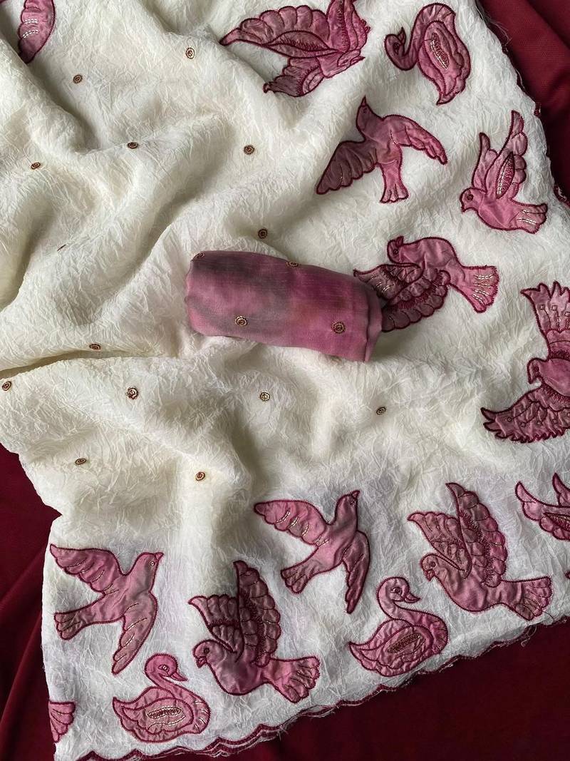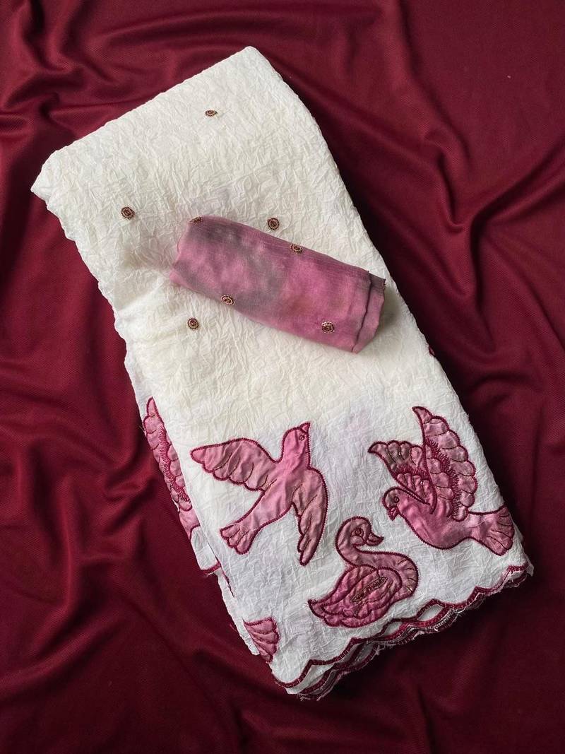 Product Description | Crushed Fabric Saree With Beautiful Applique Pattern Panel Of Bird Design All Over Saree Worth Cutwork Teamed With Beautiful Blouse With Special Effect |