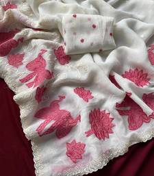 White premium crunchy silk blend saree with applique work pattern all over the saree with embroidery and scallop border