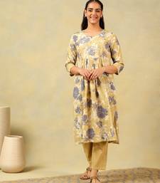 | Product Description | Step Into Effortless Style With Our Kimaya Kurta Set, Featuring A Unique Ochre Floral Bloom Print Usp. The Earthy Mustard Yellow Base Is Beautifully Adorned With Large, Dusty Blue Floral Motifs, Creating A Sophisticated And Natural Color Palette. This Ensemble Is Defined By Its Pintuck Pleated Bodice And An Intricately Embroidered Yoke, Offering A Graceful, Flared Silhouette That Blends Traditional Charm With Modern Comfort. |