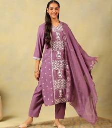 Exude Artisanal Charm With The Lavanya Set, Featuring A Sophisticated Mauve And Ivory Geometric Block Print Usp. This Elegant Suit Set Is Rendered In A Muted Mauve Lilac Hue And Is Decorated With A Detailed White Geometric Pattern And Botanical Motifs Arranged In A Sleek Vertical Panel Design. The Kurta Is Designed With A Classic Notched V Neckline And Intricate Scalloped Embroidery Along The Dupatta Border, Adding A Touch Of Traditional Sparkle To The Ensemble. Complete With Solid Mauve Trousers And A Matching Embroidered Dupatta, This Set Offers A Refined, High Impact Look For Formal Gatherings And Festivities.