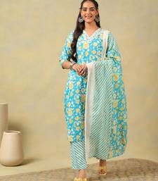 | Product Description | Brighten Your Festive Wardrobe With The Myra Set, Featuring A Radiant Turquoise And Yellow Floral Vine Usp. This Vibrant Ensemble Showcases A Turquoise Kurta Blooming With Sunny Yellow And Crisp White Floral Motifs. The Design Is Beautifully Detailed With A White Embroidered V Neckline Border That Adds A Touch Of Classic Refinement To The Straight Cut Silhouette. It Is Paired With Coordinating Trousers And A Lightweight Dupatta, Both Featuring A Modern Diagonal Stripe Pattern That Perfectly Balances The Botanical Print. |