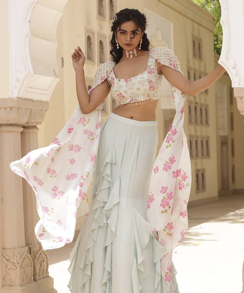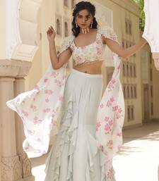 Green plain fish cut ruffle detailed chiffon lehenga with embroidered blouse