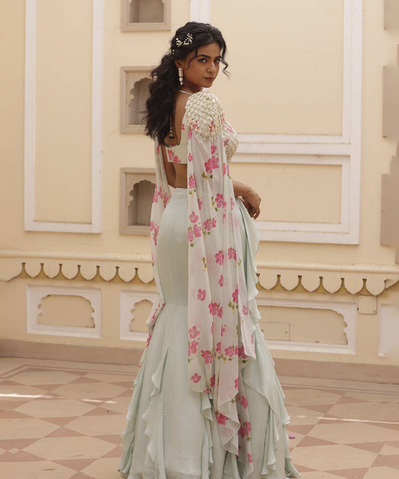 | Product Name | Green Plain Fish Cut Ruffle Detailed Chiffon Lehenga With Embroidered Blouse | |