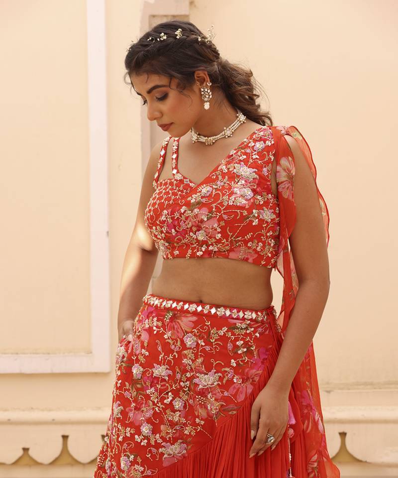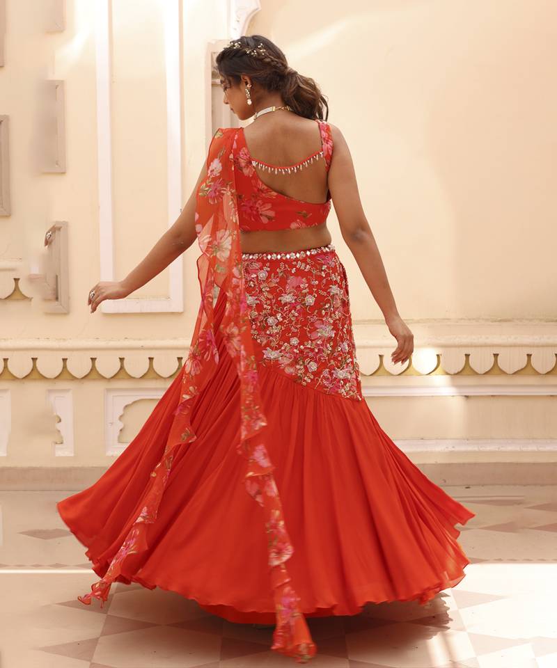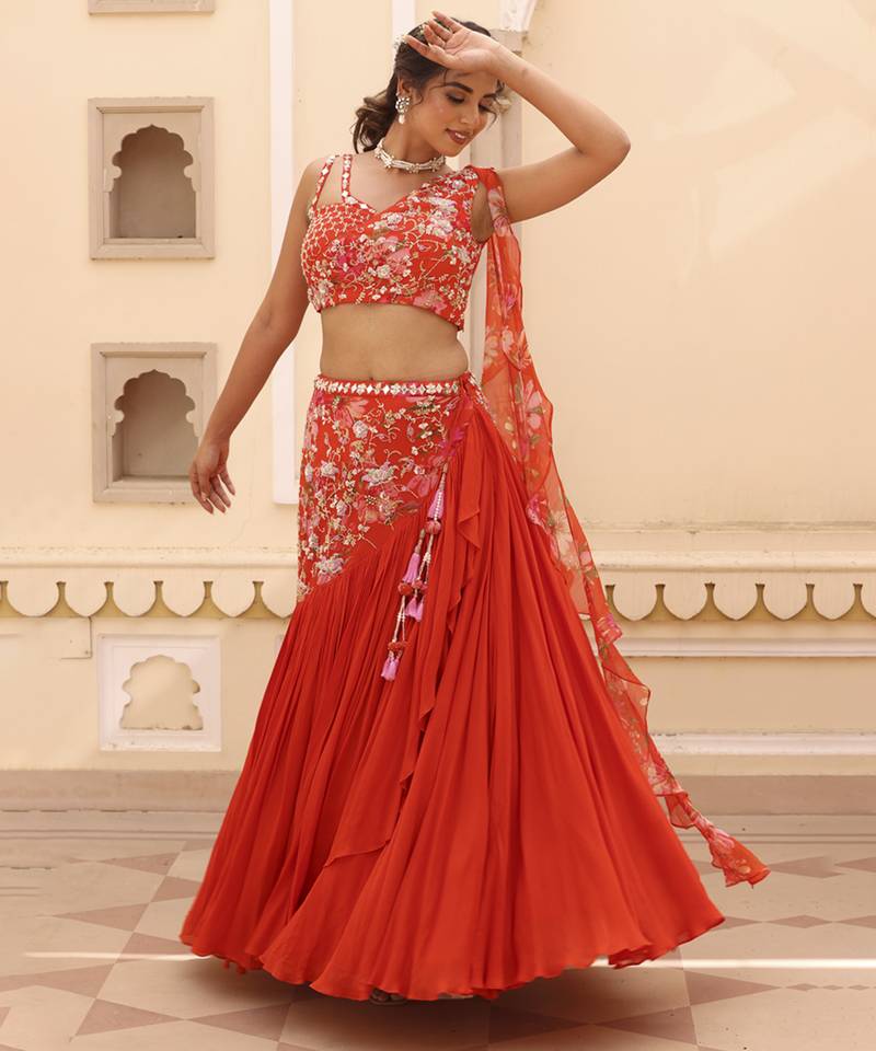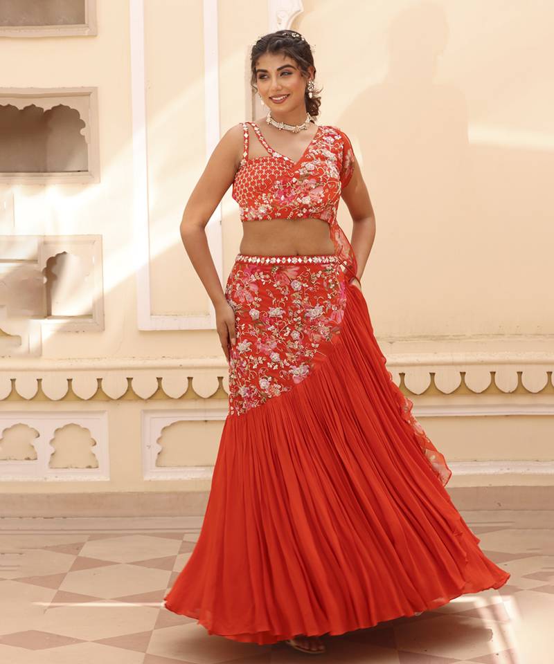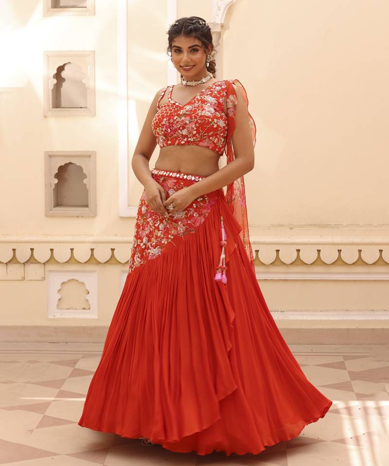 | Product Description | The Orange Chiffon Plain Lehenga With Embroidered Blouse Is A Vibrant And Elegant Ensemble That Beautifully Blends Minimalist Design With Intricate Craftsmanship. The Lehenga, Crafted From Soft And Lightweight Chiffon, Features A Rich Orange Hue That Radiates Warmth And Festive Charm.