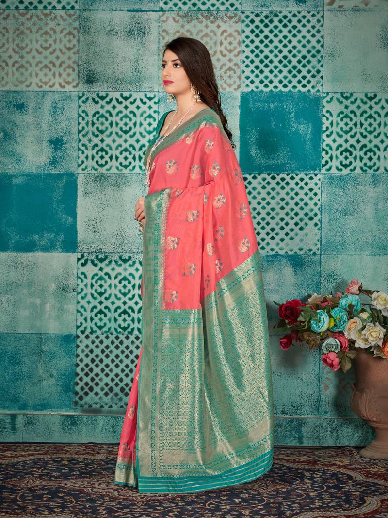 | Product Description | Manohari Peach Banarasi Silk Woven Saree With Blouse Peice |