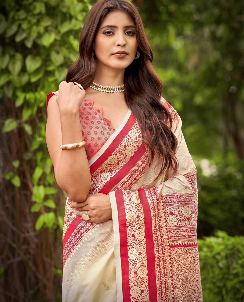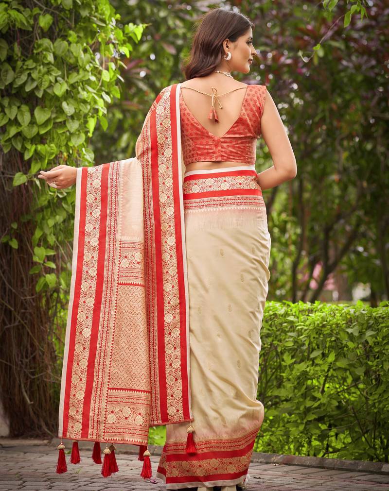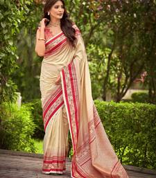Banarasi satin silk blend woven creamy beige & red saree with heavy jacquard work saree with blouse piece