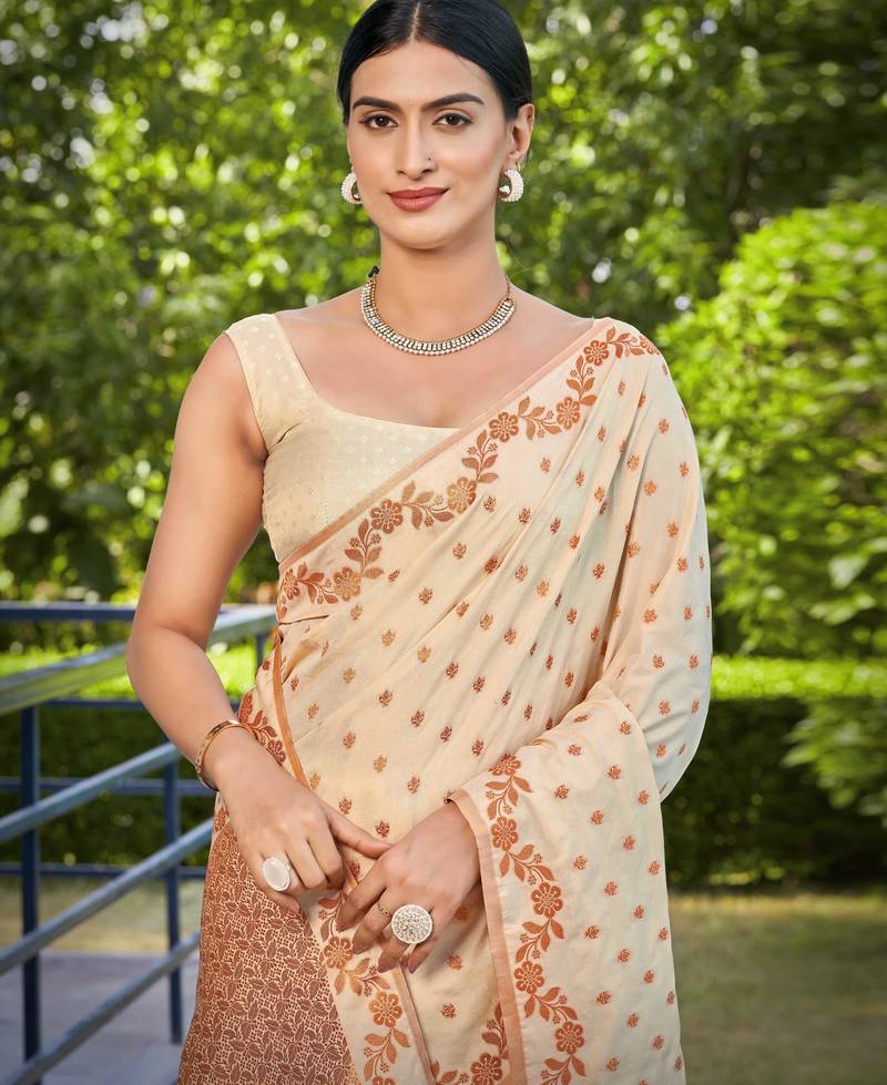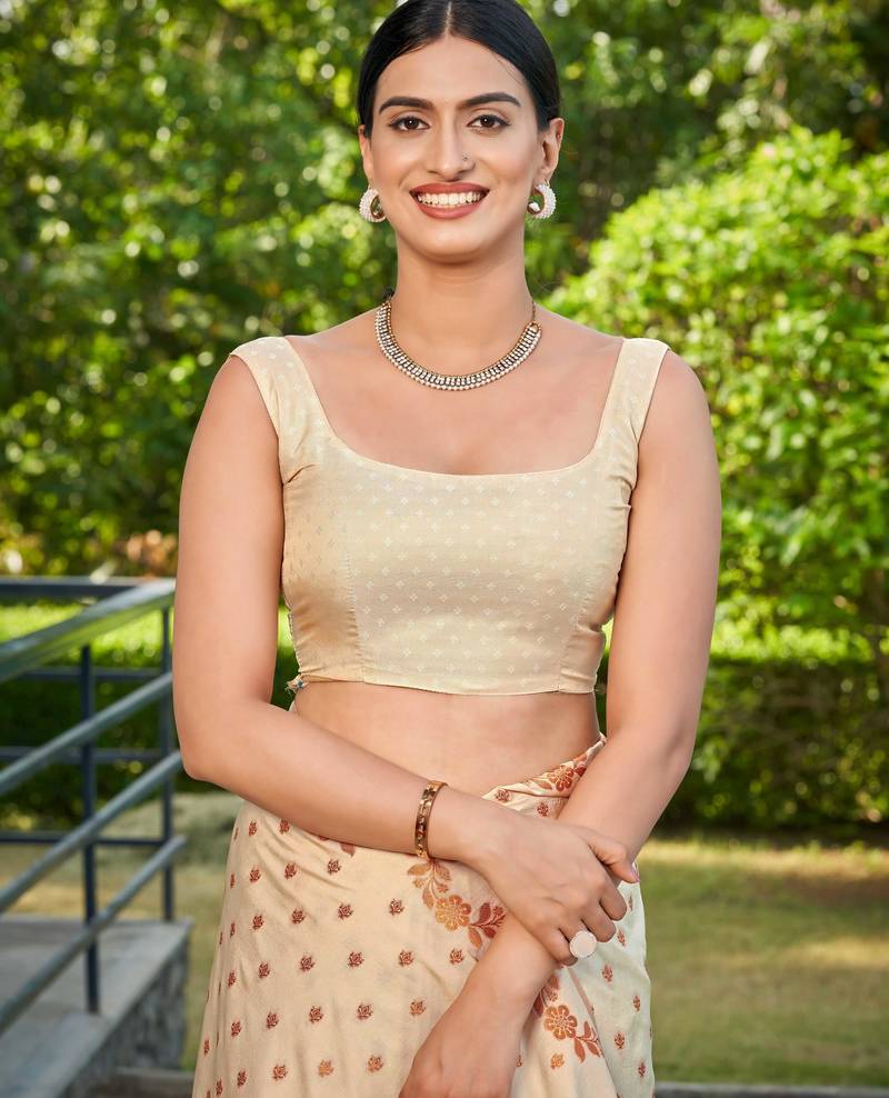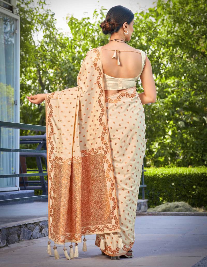Banarasi satin silk blend woven creamy beige saree with heavy jacquard work saree with blouse piece
