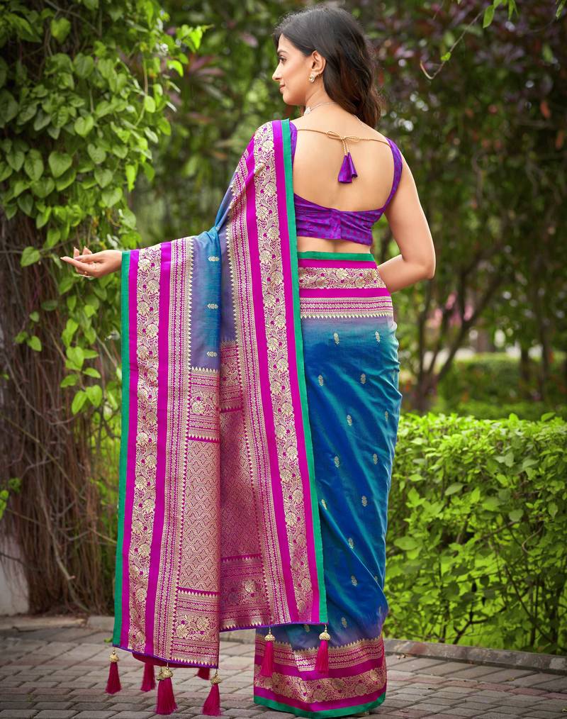 Banarasi satin silk blend woven deep blue & pink saree with heavy jacquard work saree with blouse piece