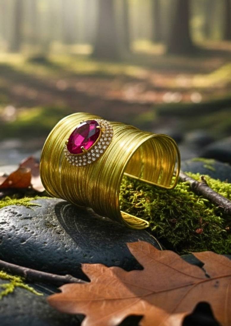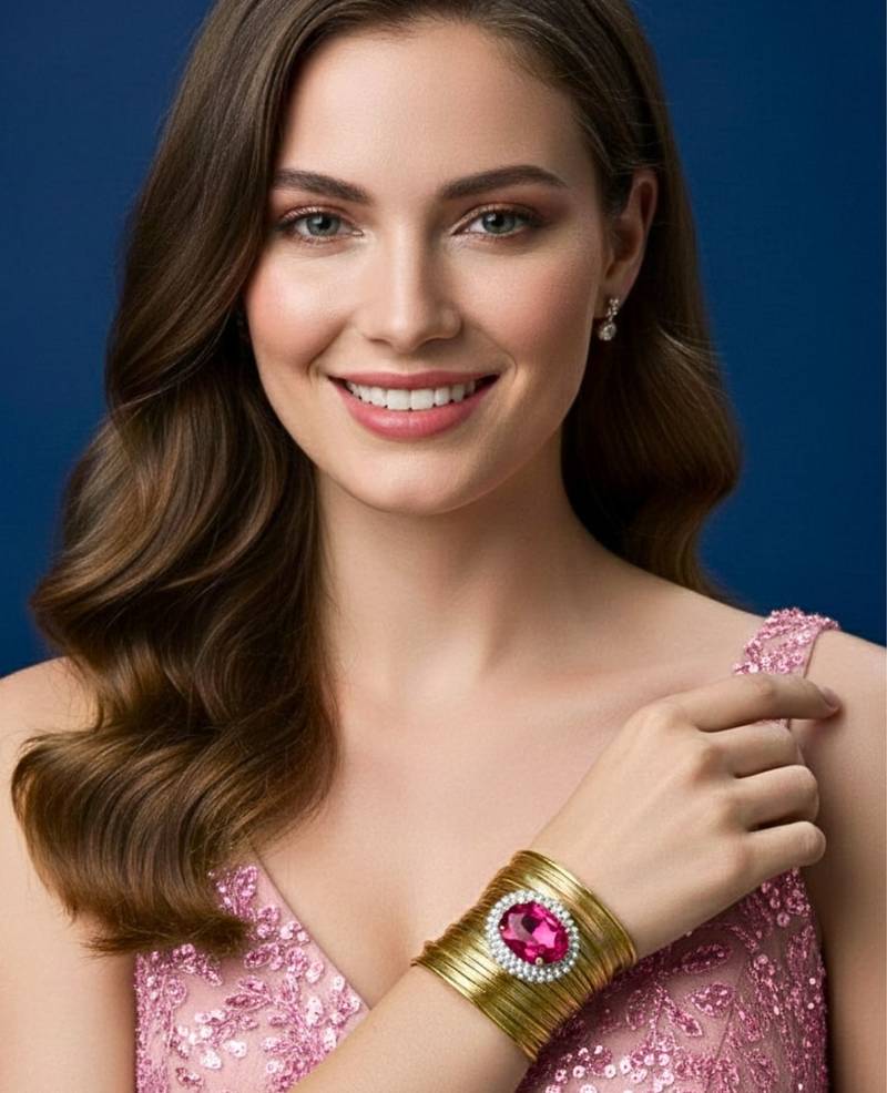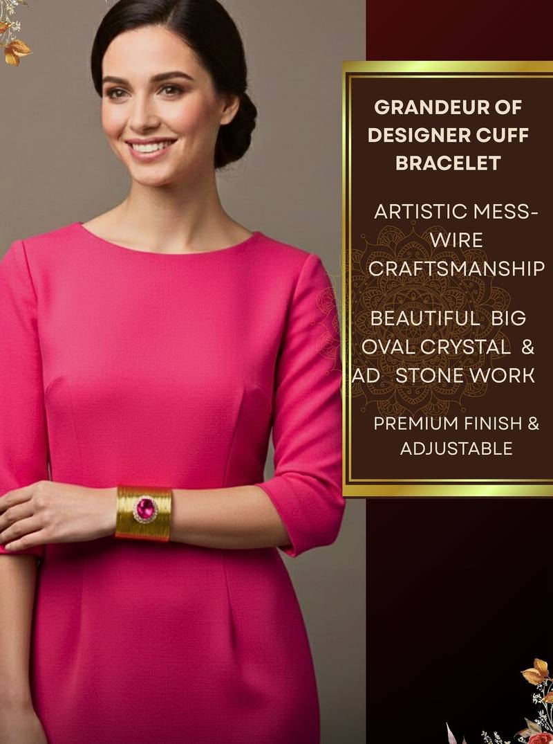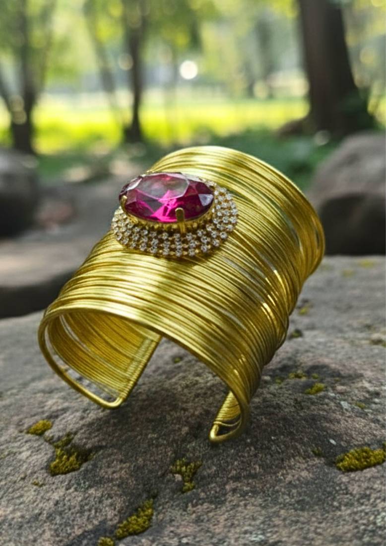 | Product Description | Gold Plated Mess Wire Cuff Bracelet Adorned With A Scattered Dazzling Hot Pink Korean Cz Shiny Glass Crystal Stone. Its Intricate Wire Design And Bold Centerpiece Exude Elegance And Sophistication. Lightweight, Adjustable, And Perfect For Elevating Both Casual And Festive Looks. A Timeless Statement Piece For Every Jewelry Lover. |