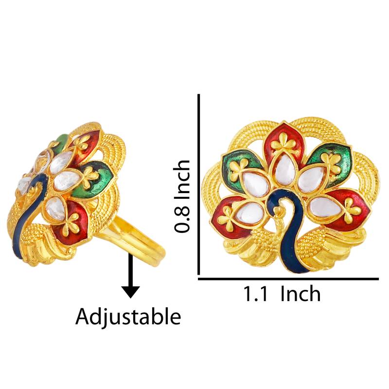 | Product Description | These Are Hand Made Peacock Theme South Indian Temple Theme Rings Made From Tin And Lead Free Alloy Metal ,Each Ring Is Decorated With Kundan And Ad Stone Work And One Gram Gold Plating Is Done On Them ,These Rings Can Be Wear In Any Finger Size As These Are Adjustable Which Can We Adjusted Easily By Just Expandind Its Ring Circle.Just Wipe With Dry Cloth After Every Use For Long Lasting Life. |