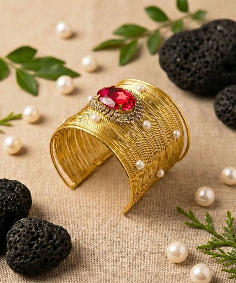 | Product Description | Gold Plated Mess Wire Cuff Bracelet Adorned With A Aaa Grade Pearls Placed In Pattern All Over The Bracelet And Dazzling Big Red Korean Cz Shiny Glass Crystal Stone.Its A Lightweight, Adjustable, And Perfect For Elevating Both Casual And Festive Looks. A Timeless Statement Piece For Every Jewelry Lover. |