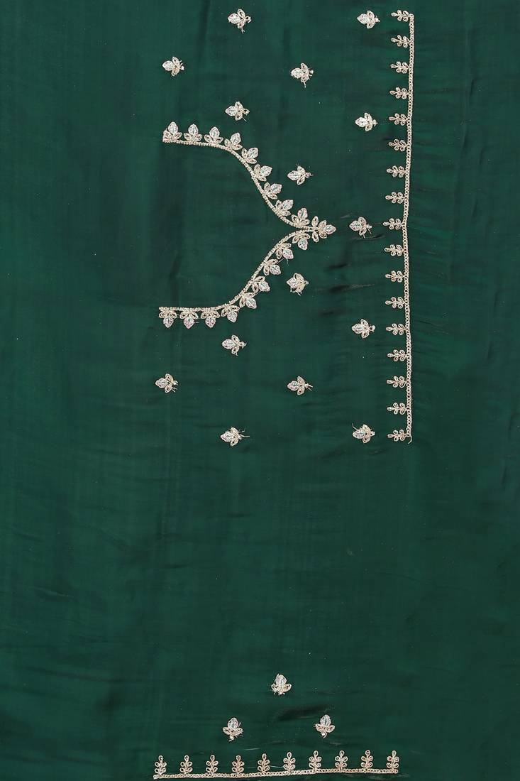| Product Description | This Dark Green Crepe Silk Saree Is Adorned With Detailed Coding Embroidery And Zarkan Diamond Work Across The Body And Along The Border, Creating A Rich And Intricate Design. The Crepe Silk Fabric Offers A Smooth Texture With A Graceful Drape, Making It Suitable For Weddings, Festive Gatherings, And Traditional Occasions. The Saree Is Paired With A Matching Unstitched Crepe Silk Blouse Piece That Allows Customization According To Preferred Fit And Styling. Designed With Attention To Traditional Embroidery Techniques, This Embroidered Crepe Silk Saree Reflects Refined Craftsmanship Combined With Elegant Fabric Flow. |