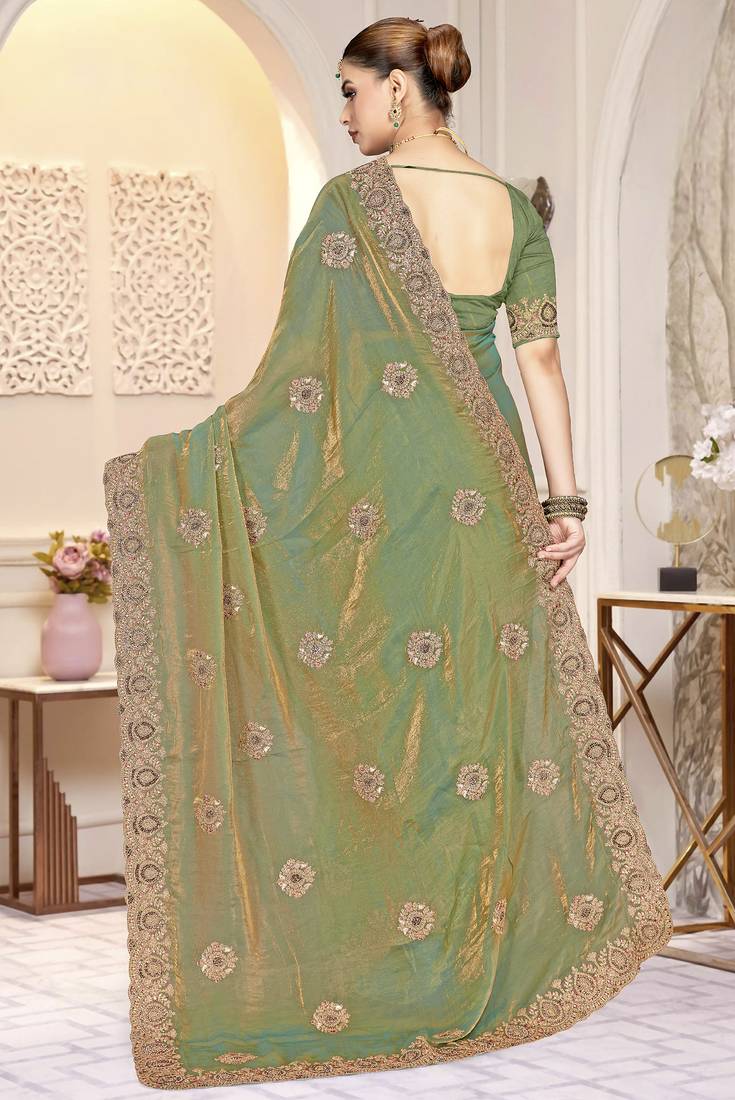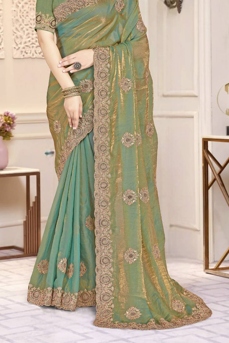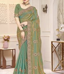 Green color heavy coding zarkan embroidered work satin silk saree sari