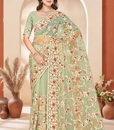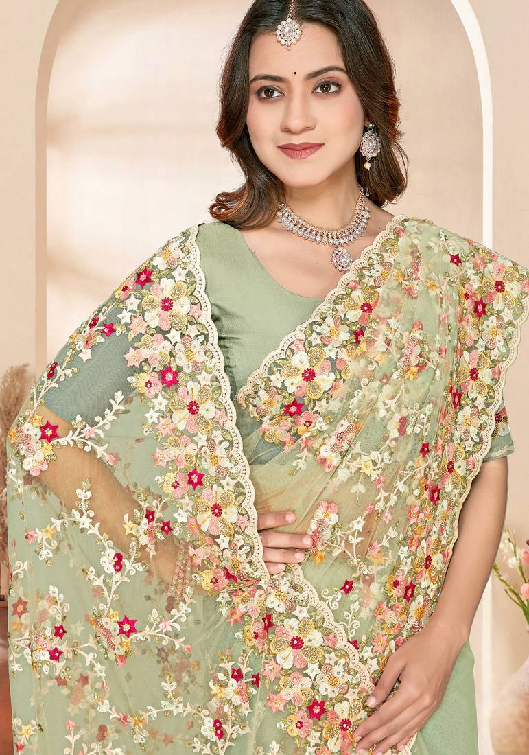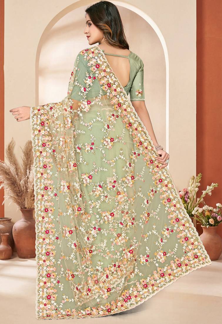 Product Name Green Heavy Resham Sequin Embroidered Work Net Saree Sari For Women