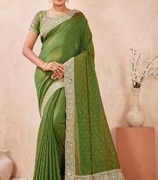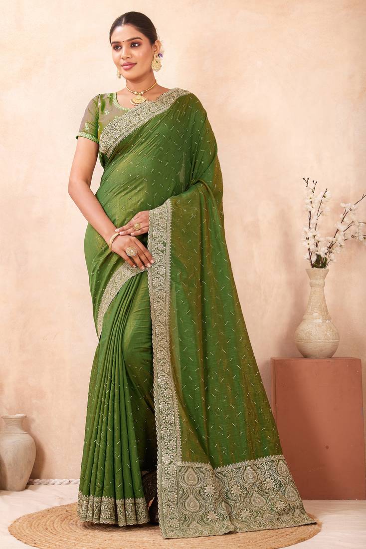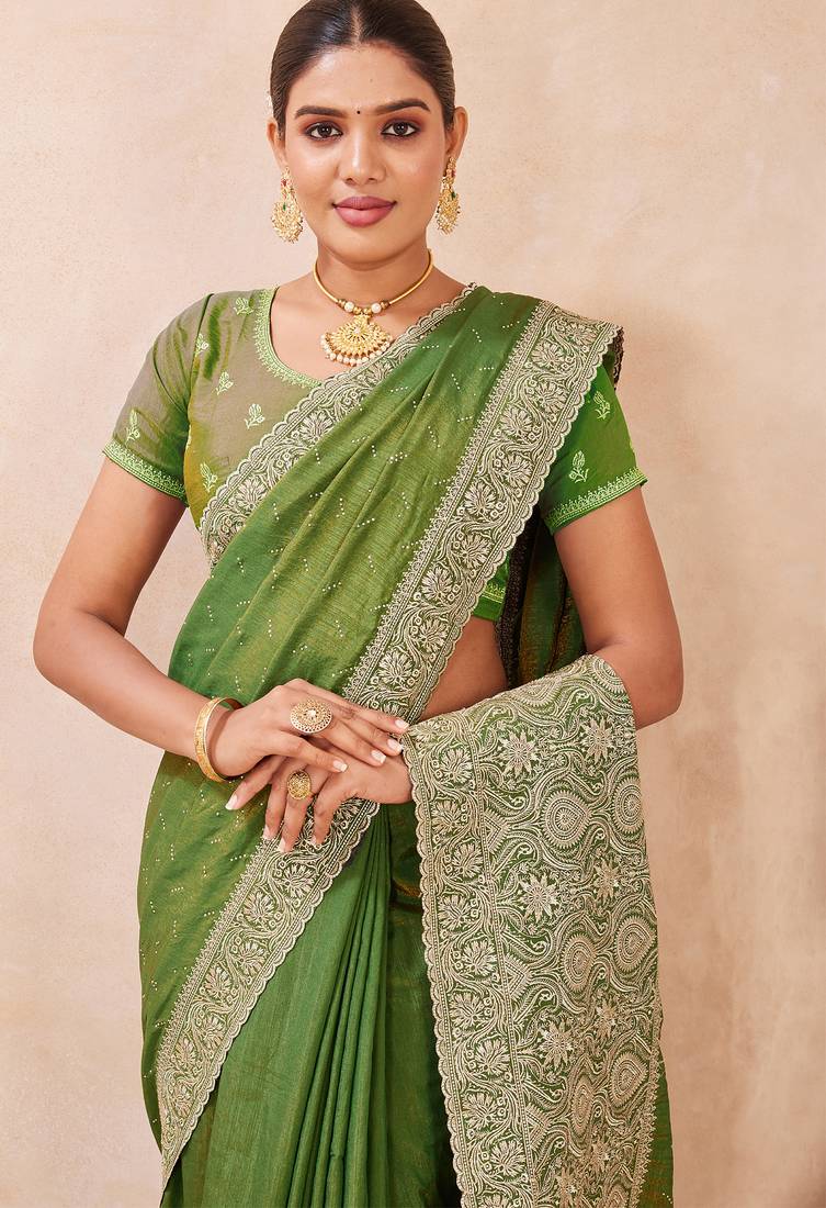 Green zari embroidered siroski stone work two tone silk blend saree sari