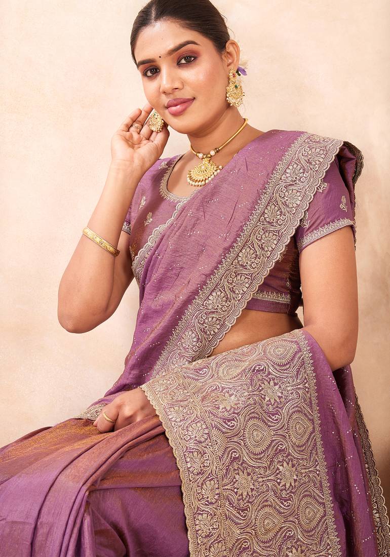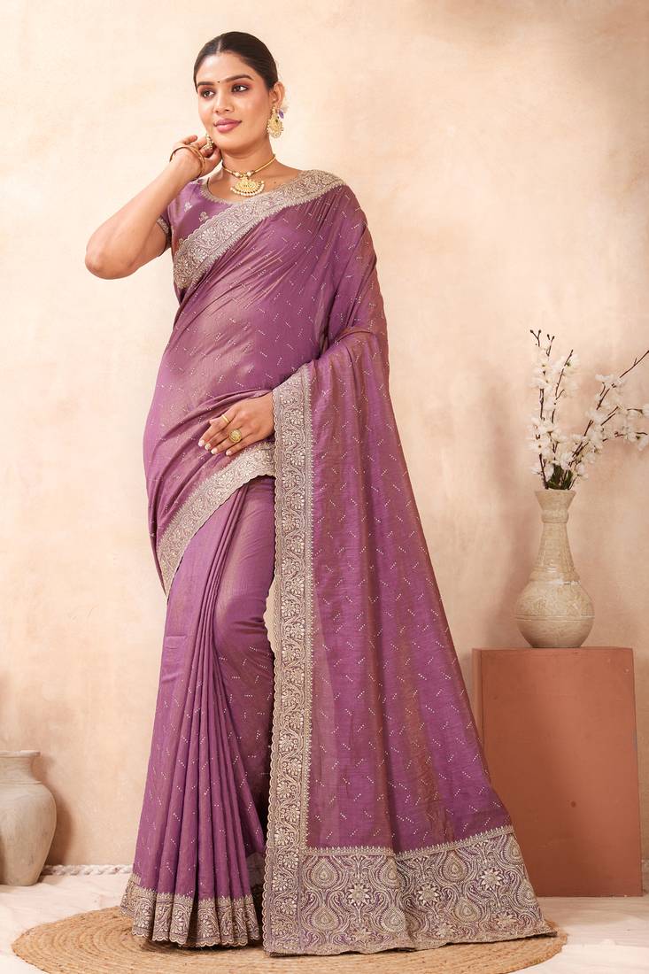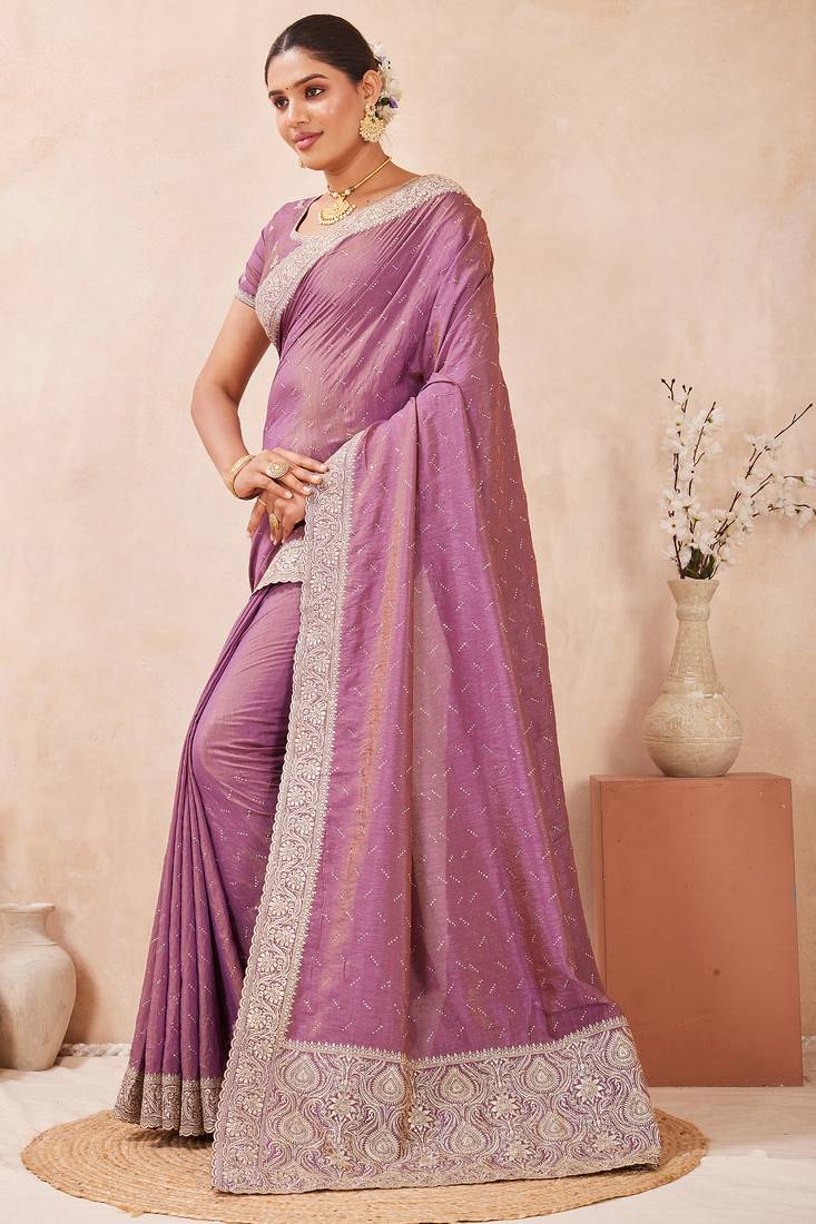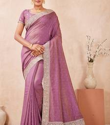 Lavender zari embroidered siroski stone work two tone silk blend saree sari
