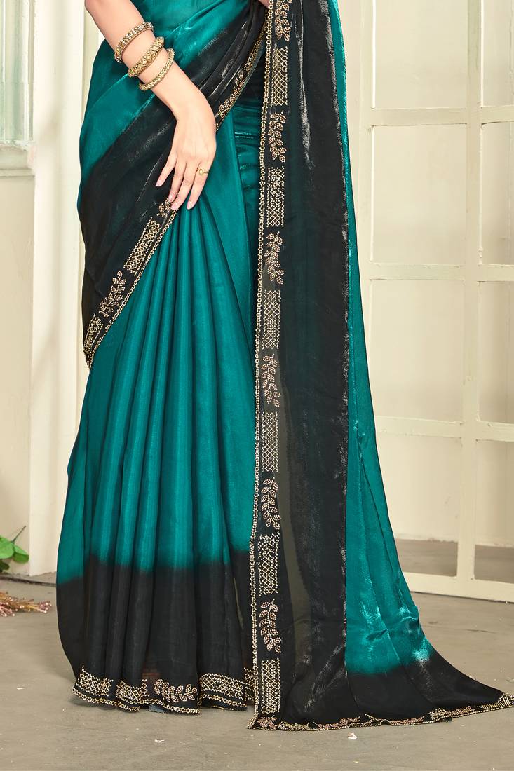 | Product Description | Get An Elegant Looking With This Teal Blue, Black Half N Half Trendy Designer Indian Bollywood Ethnic Party Wear Traditional Wedding Satin Silk Saree, Completed With Zarkan Diamond Stone Border Work. It Will Carry Black Color Unstitched Satin Silk Blouse Piece, Which Can Be Customized Up To Max 42 Indian Standard Size And Its Length 80 Cms. You Can Wear This Saree In Party Wedding Function And Any Other Occasion. (Slight Variation In Color Is Possible Due To Flash Used During Photo Shoot.) |
