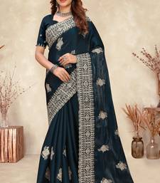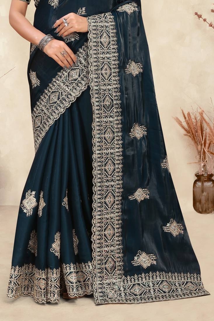 Teal blue coding embroidered zarkan diamond work crepe silk blend saree for women