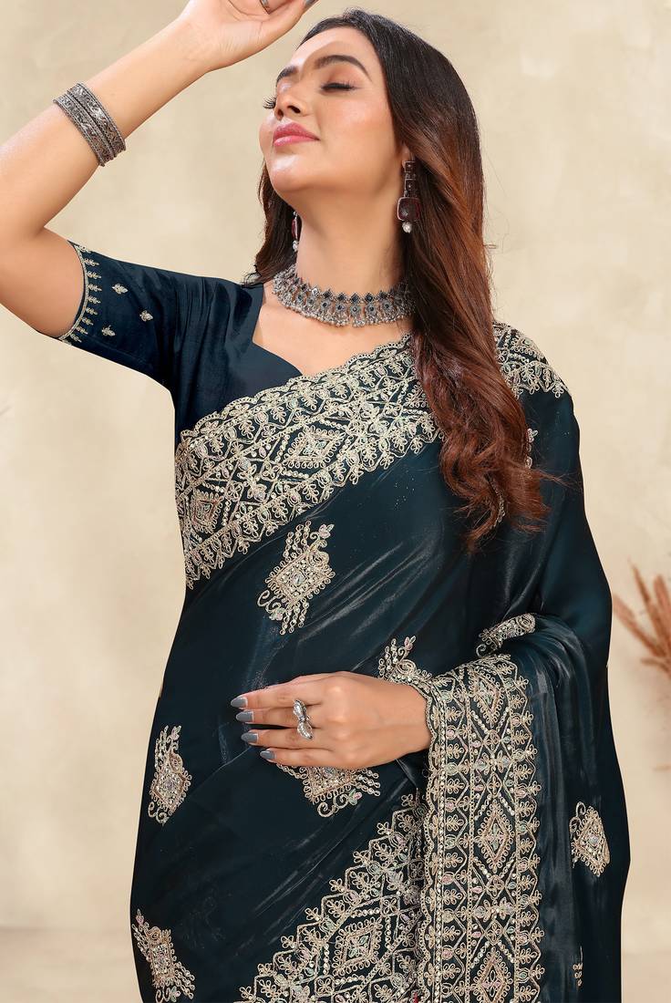 | Product Name | Teal Blue Coding Embroidered Zarkan Diamond Work Crepe Silk Blend Saree For Women | |