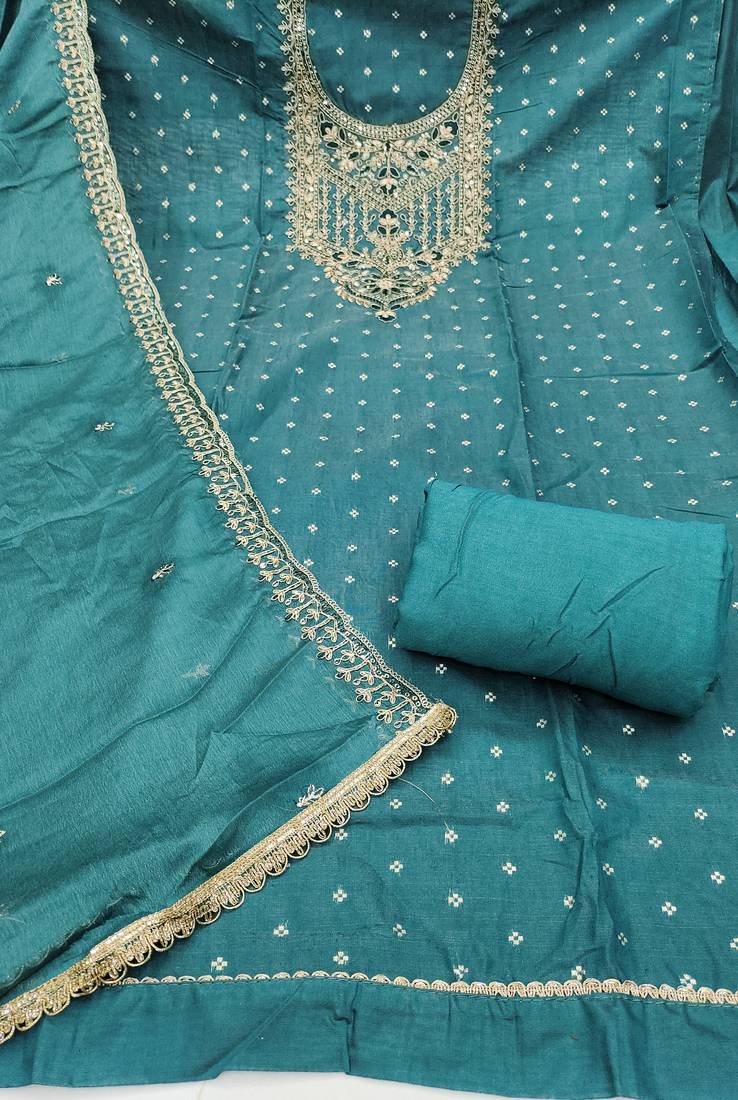 | Product Description | Upgrade Your Ethnic Wardrobe With This Elegant Sea Green Unstitched Salwar Kameez Crafted From Premium Modal Chanderi Fabric. The Top Features Exquisite Weaving And Detailed Embroidered Neck Design, Complemented By A Stylish Fancy Border That Enhances Its Festive Appeal. It Includes A Matching Unstitched Rayon Bottom For A Perfect Custom Fit And A Coordinating Sea Green Nazneen Dupatta With Intricate Embroidery. Ideal For Weddings, Parties, Or Traditional Celebrations, This Luxurious Dress Material Blends Comfort With Sophistication. Experience Handcrafted Artistry And Timeless Design In Every Piece |