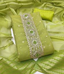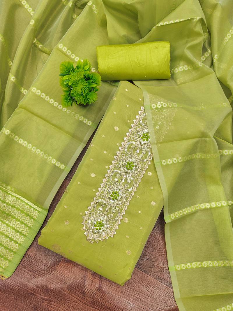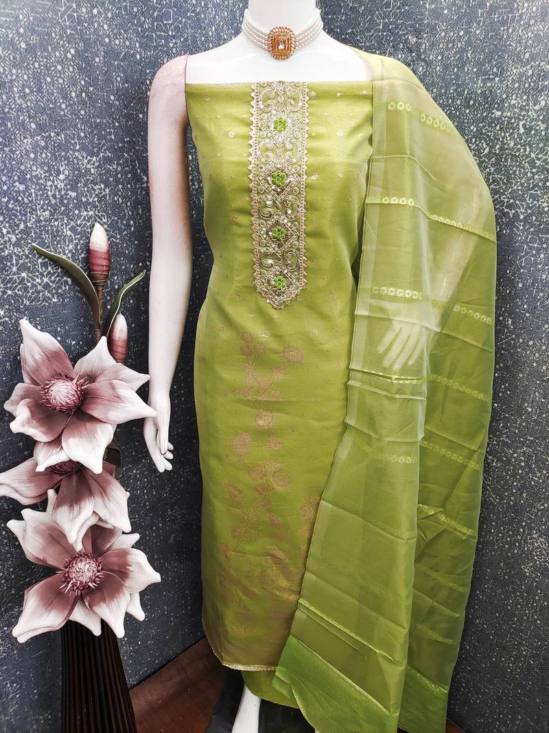 green weaving & embroidered simmer dress material unstitched