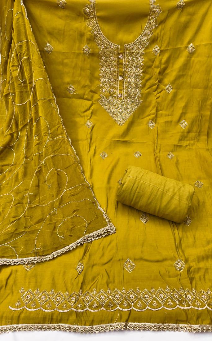 | Product Description | Women's Mehandi Unstitched Embroidery And Fancy Border Roman Glass Cotton Dress Material Having Mehandi Color Unstitched Bottom Of Rayon Fabric And Mehandi Color Dupatta Of Nazneen Chiffon Material With Designer Mehandi Colour In Roman Glass Cotton Rayon Nazneen Chiffon Fabric With Work Of Heavy Embroidery And Fancy Border With Designer Embroidered Dupatta|| Images Are For The Referance Purpose Only, Color Of The Actual Product May Little Vary From The Image Due To Screen Resolution |
