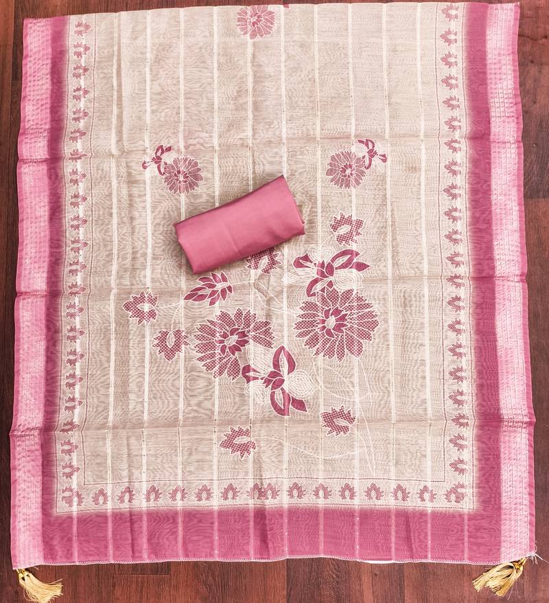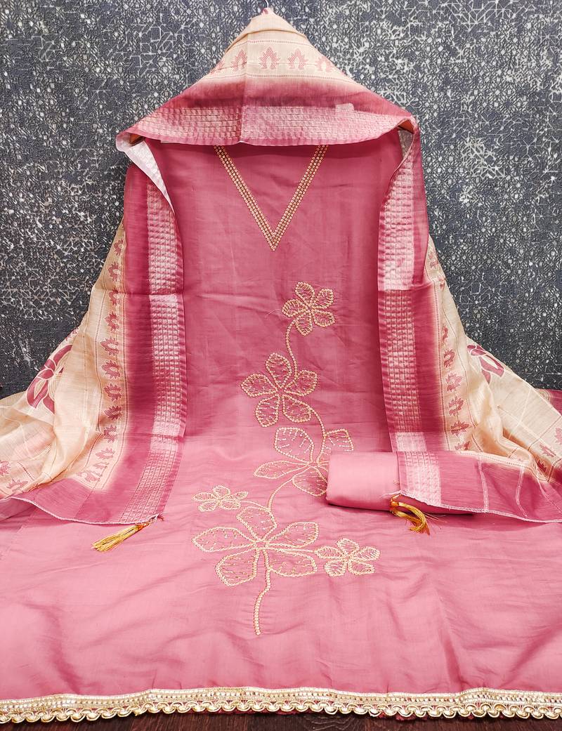 Women's pink thread embroidery silk dress material unstitched