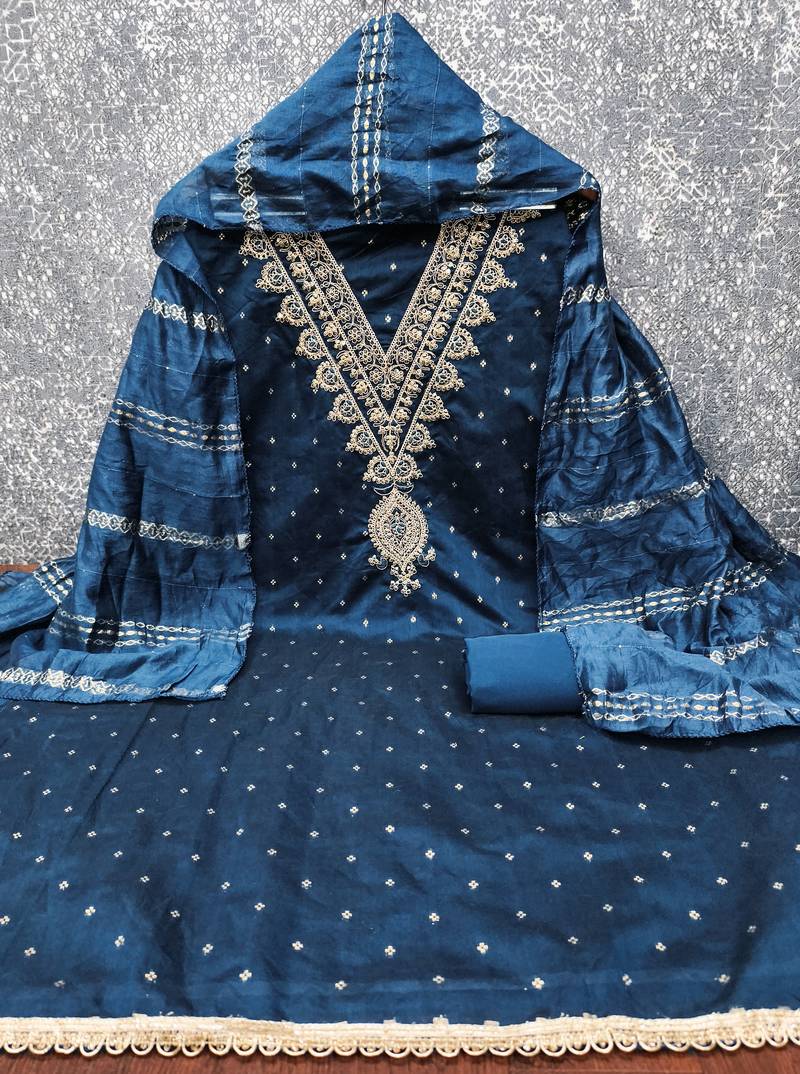 teal blue embroidery chanderi dress material unstitched