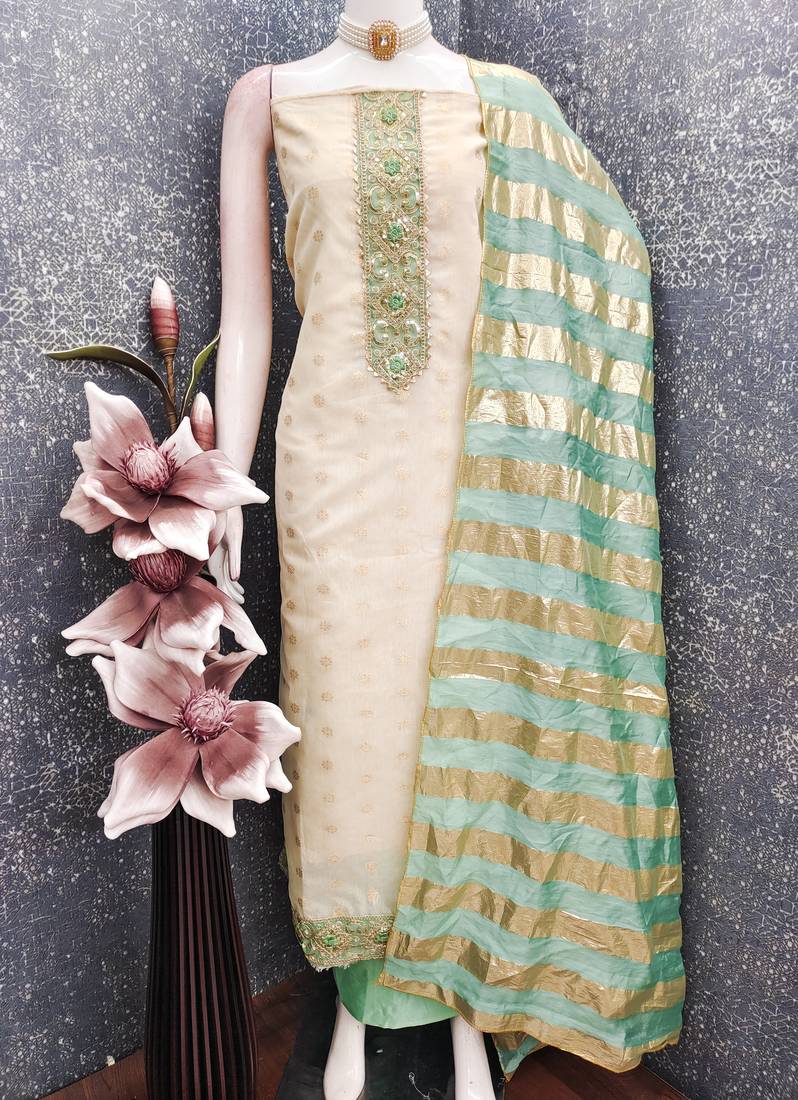 | Product Description | Women's Off White Unstitched Heavy Weaving & Embroidered Simmer Dress Material Having Sea Green Color Unstitched Bottom Of Santoon Fabric And Sea Green Color Dupatta Of Simmer Jacquard Material With Designer Off White Colour In Simmer Jacquard Santoon Fabric With Work Of Heavy Weaving Embroidered Neck And Fancy Border With Designer Woven Dupatta|| Images Are For The Referance Purpose Only, Color Of The Actual Product May Little Vary From The Image Due To Screen Resolution |
