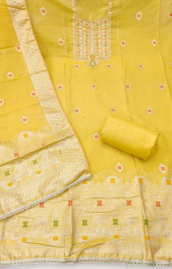 | Product Description | Women's Yellow Unstitched Weaving Handwork And Fancy Border Simmer Banarasi Dress Material Having Yellow Color Unstitched Bottom Of Rayon Fabric And Yellow Color Dupatta Of Simmer Banarasi Material With Awesome Yellow Colour In Simmer Banarasi Rayon Fabric With Work Of Heavy Weaving Handwork And Fancy Border With Designer Woven Dupatta|| Images Are For The Referance Purpose Only, Color Of The Actual Product May Little Vary From The Image Due To Screen Resolution |