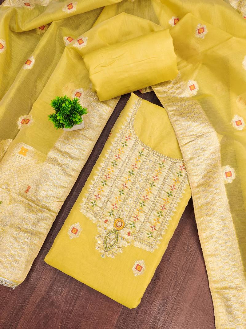 yellow weaving handwork simmer dress material unstitched