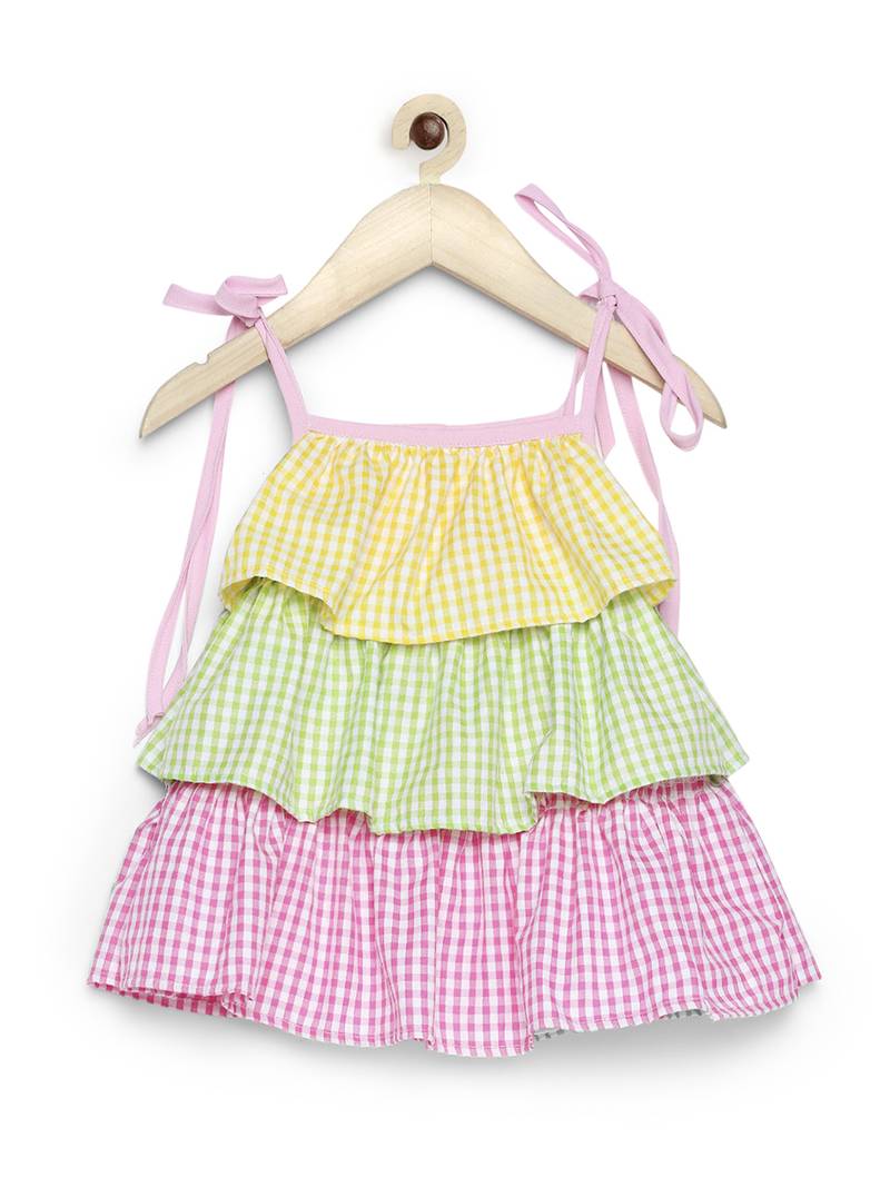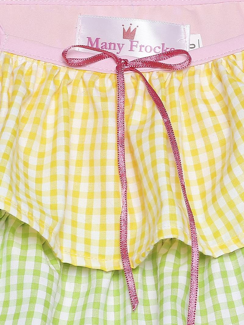 | Product Description | Many Frocks Checks Printed Sustainable Jhable Dress Yellow/Pink/Green |