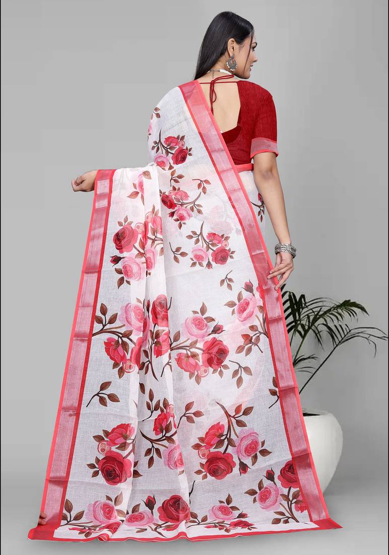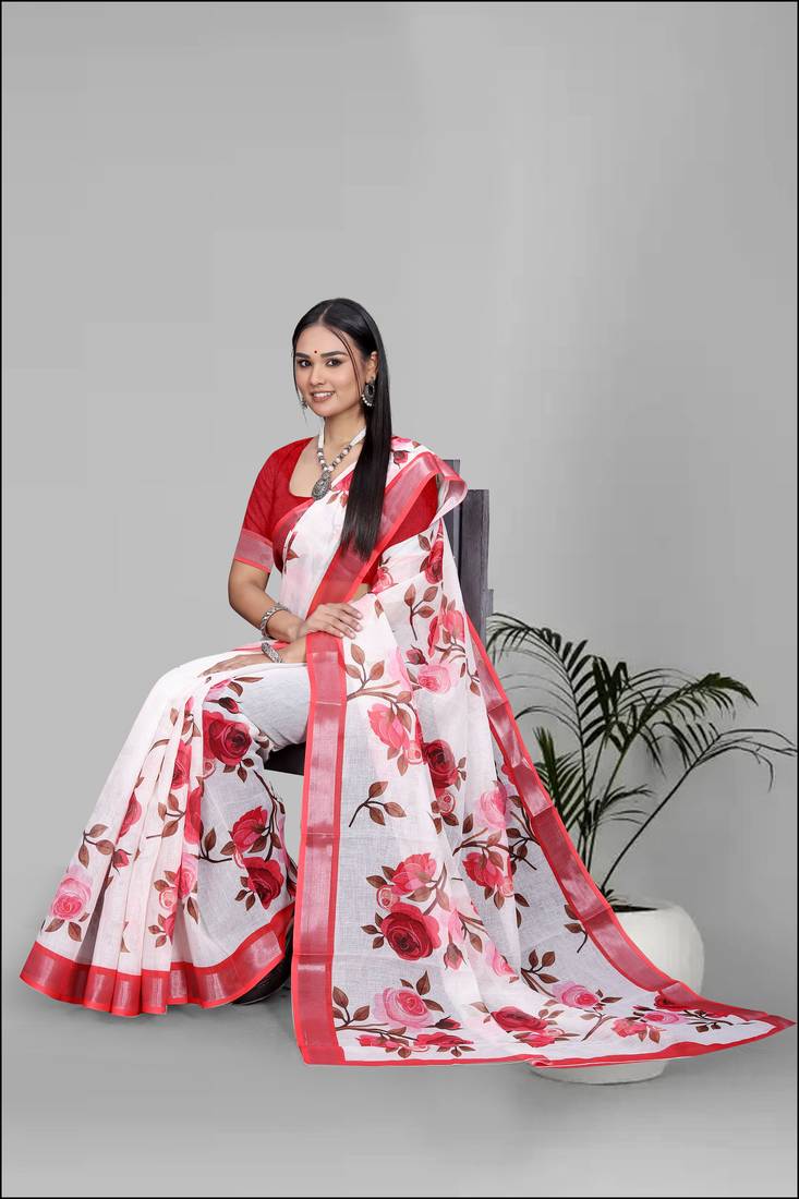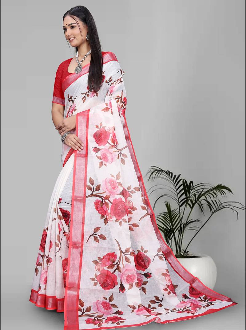 | Product Name | White Floral Linen Cotton Digital Print Saree (Red) | |