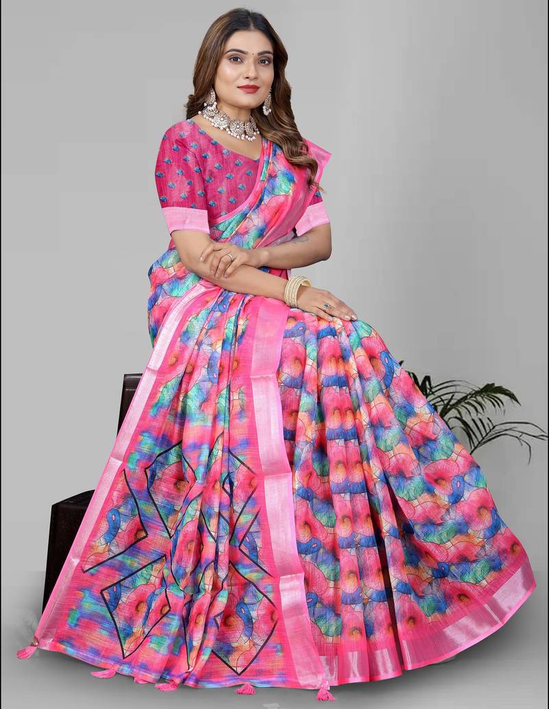 | Product Name | Pink Linen Cotton Digital Print Saree (Multicolour) | |