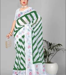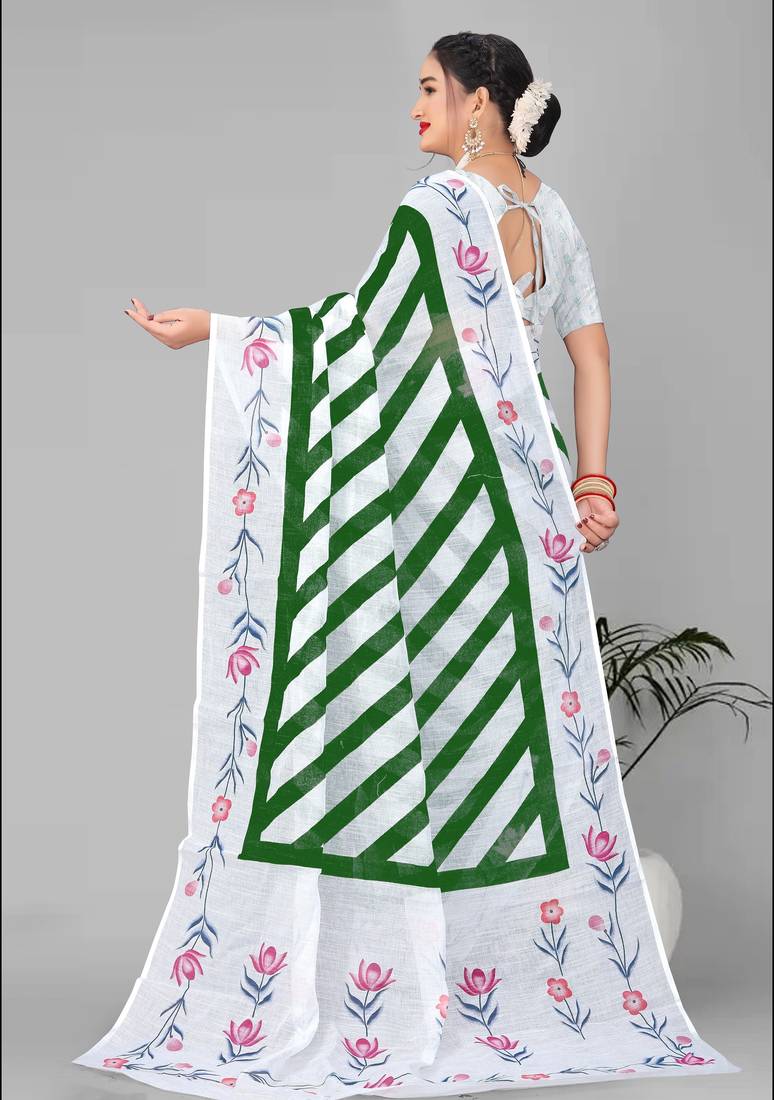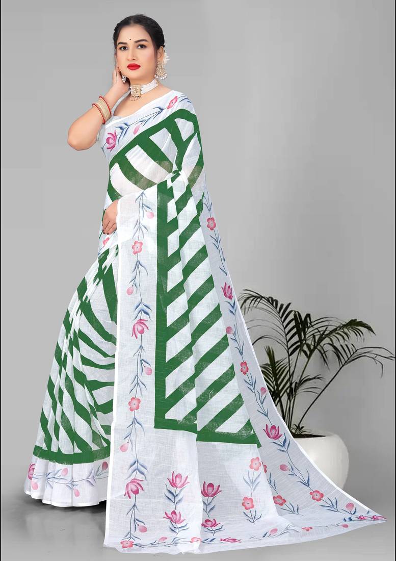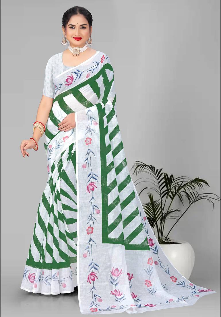 Green linen cotton lining digital print saree ( green )