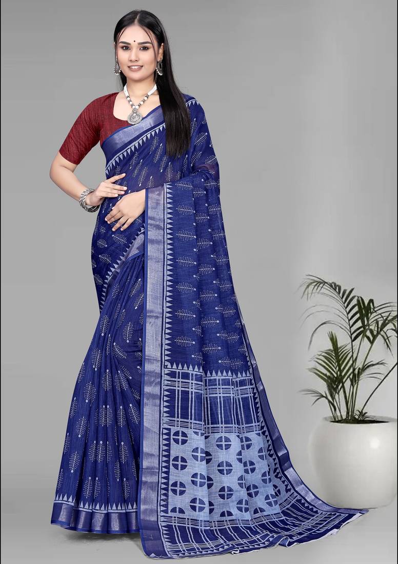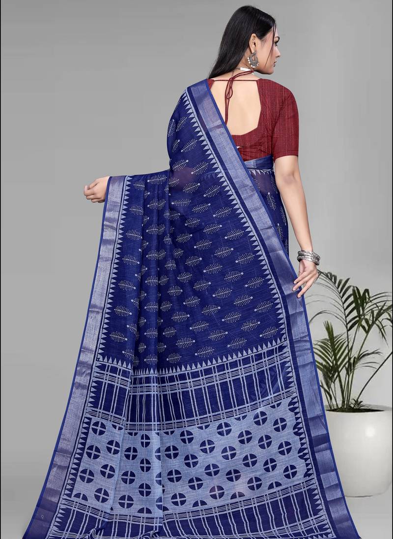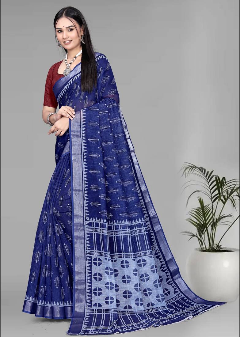 Product Name Blue Linen Digital Print Saree (Navy Blue)