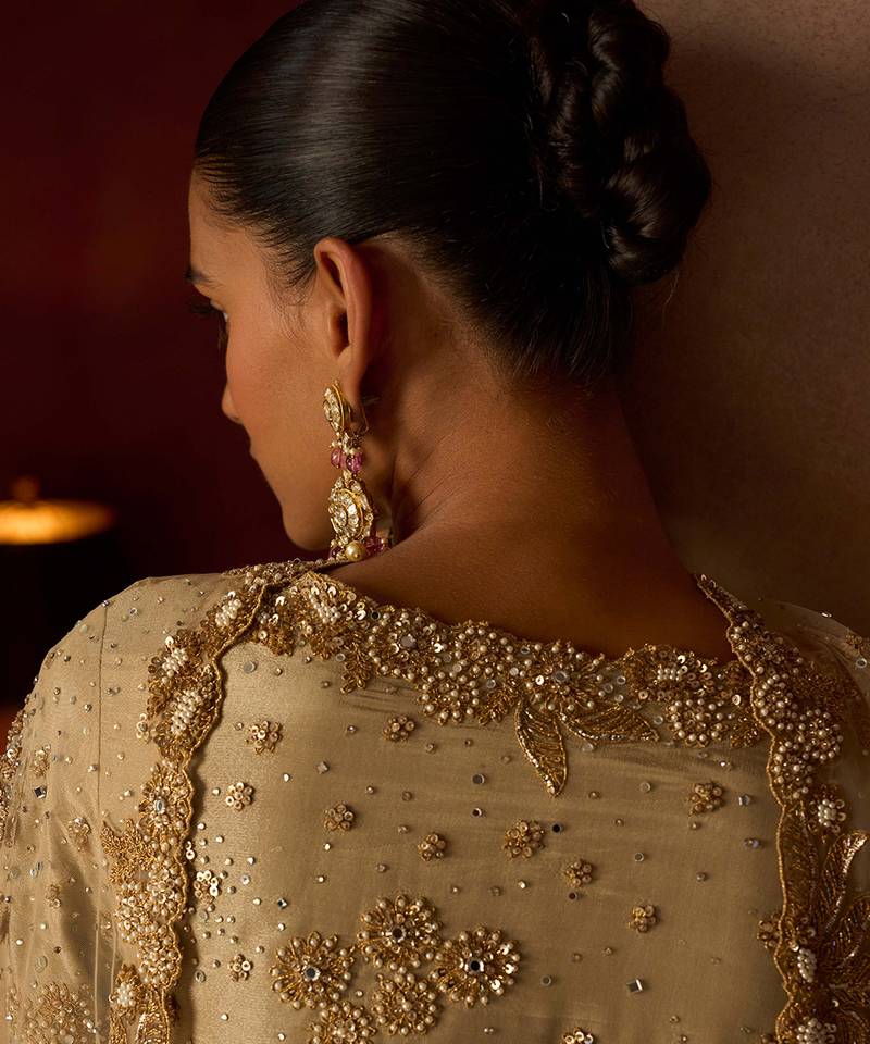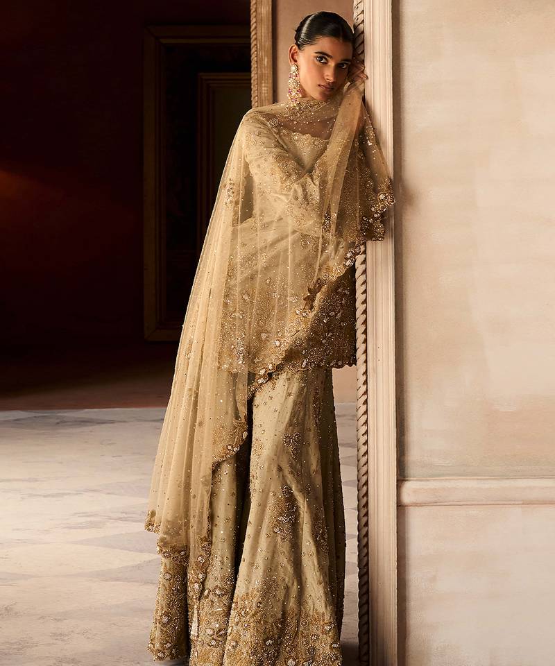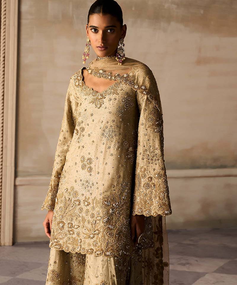 | Product Description | This Gold Embroidered Tissue Silk Sharara Set Showcases A Luminous Sheen With Intricate Detailing. The Flared Sharara Adds Graceful Movement, While The Lightweight Fabric Ensures Comfort. Perfect For Weddings And Festive Occasions, It Offers A Regal And Elegant Look With Timeless Appeal.