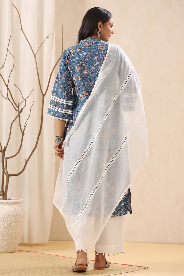 | Product Description | Look Mesmerizing In This Blue Mayori Printed Cotton Kurta. Mandarin Neckline With Y Styling Lace With Red Buttons. Straight Kurta With Pintucks On Front Upperside And Side Pockets With Slits. Three Fourth Sleeves With White Lace Bordering To Add Up The Fashion. Paired With White Straight Bottom With Small Gota On The Borders And White Dupatta With Beautiful Lacing On Borders.Disclaimer : Product Color May Slightly Vary Due To Photographic Lighting Sources Or Your Monitor Settings. |