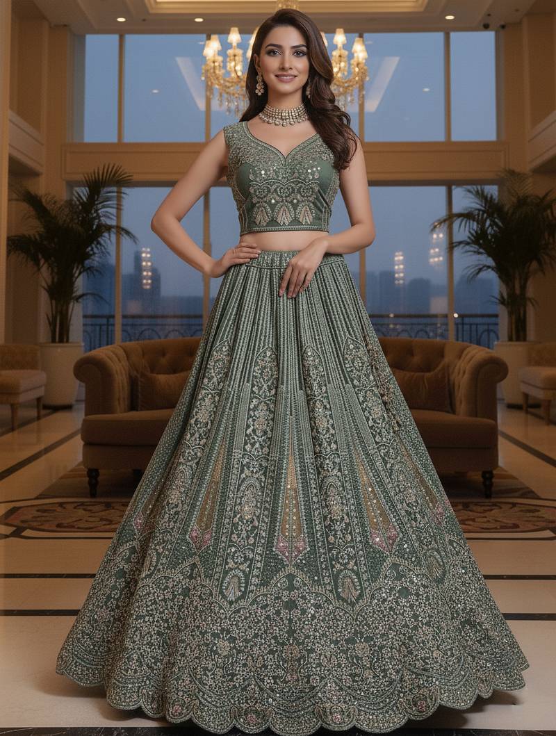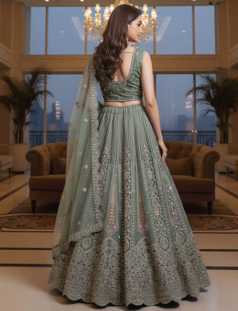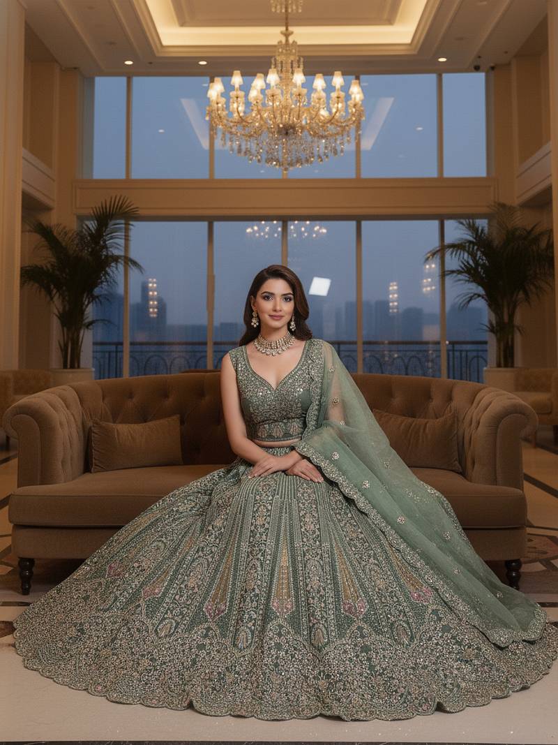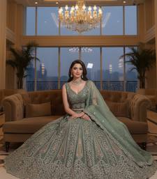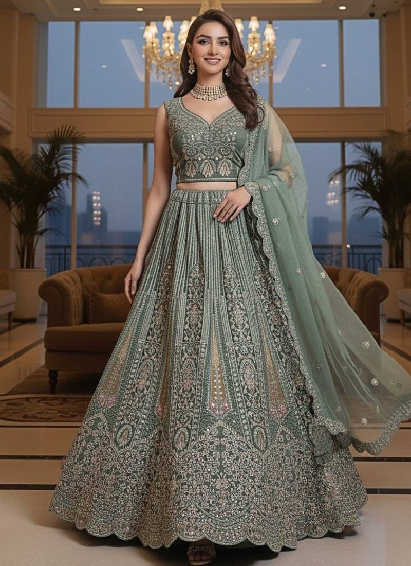 | Product Name | Attractive Pista Dori, Zari And Thread, Sequence Embrodered And Zircon Diamond Bridal Net Wedding Lehenga Choli | |