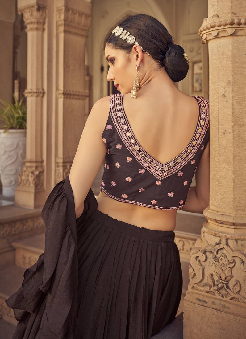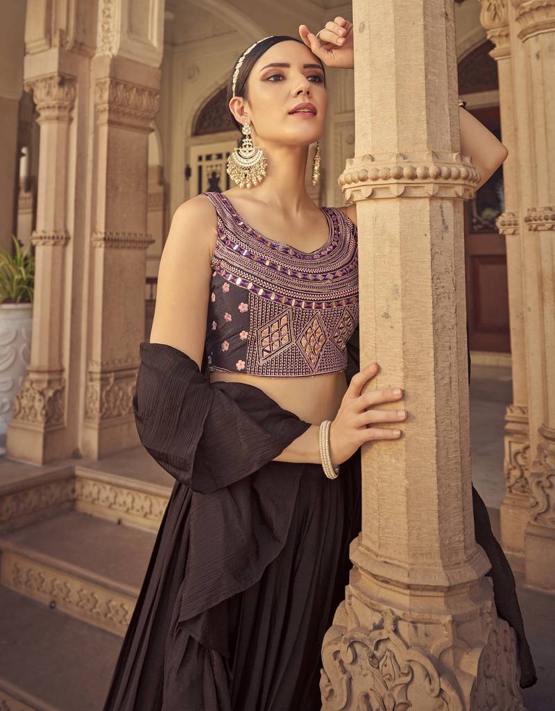 Brown thread embroidered with mirror work chinon semi stitched party wear lehenga choli