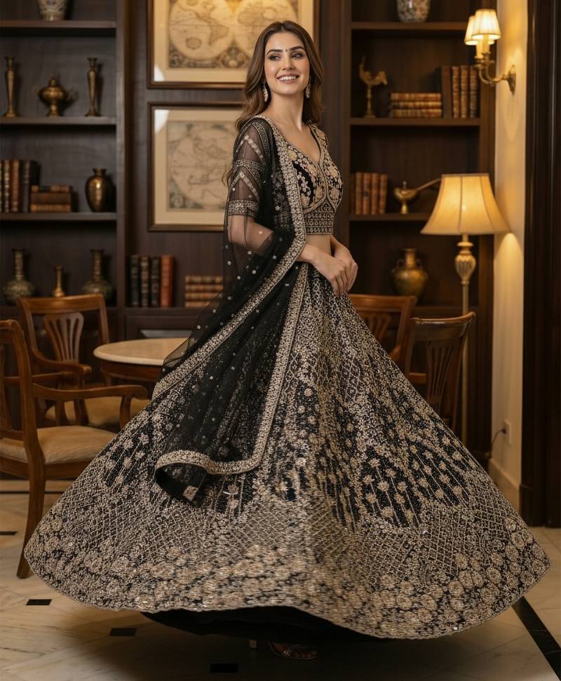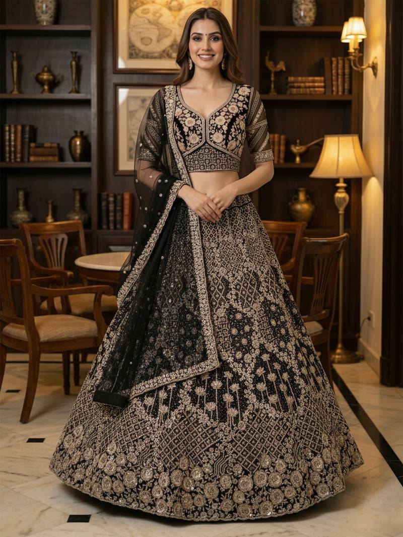 Product Name Captivating Black Double Net Crafted, Dori, Multi Thread, Sequence Embroidered Double Net Crafted Wedding Lehenga Choli
