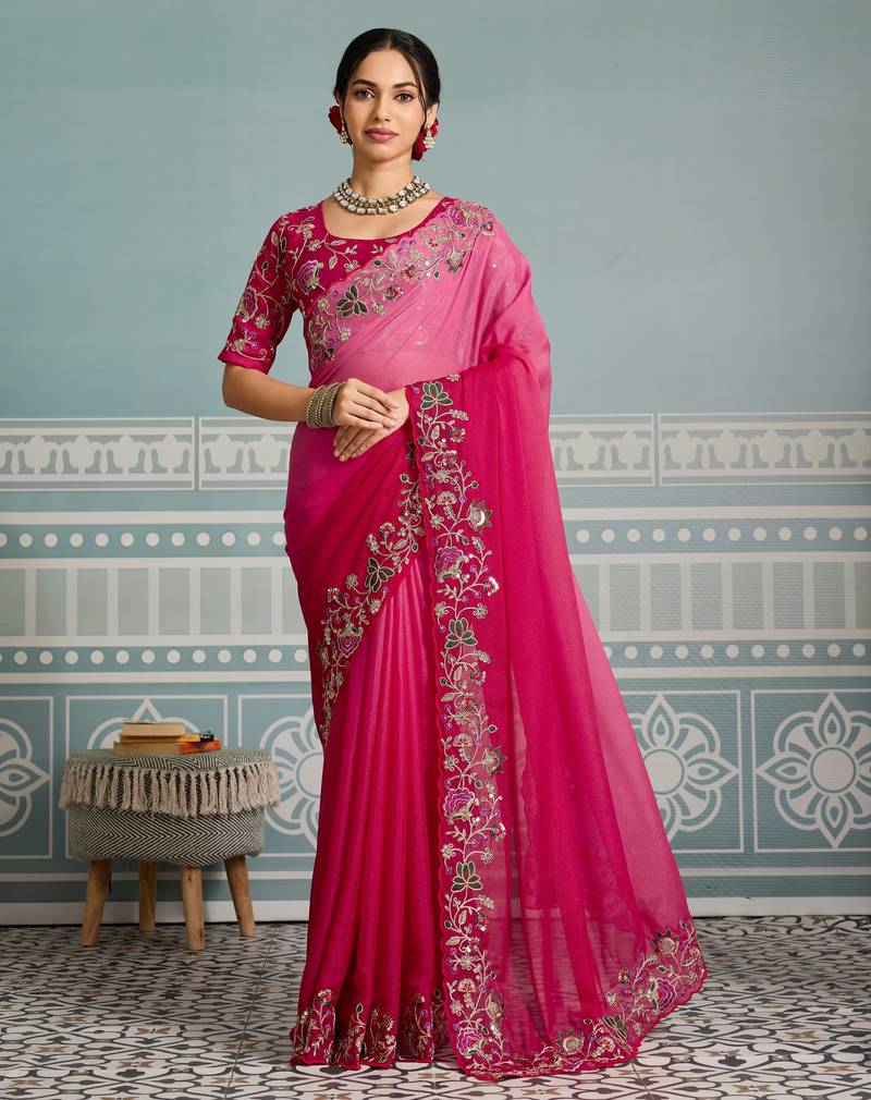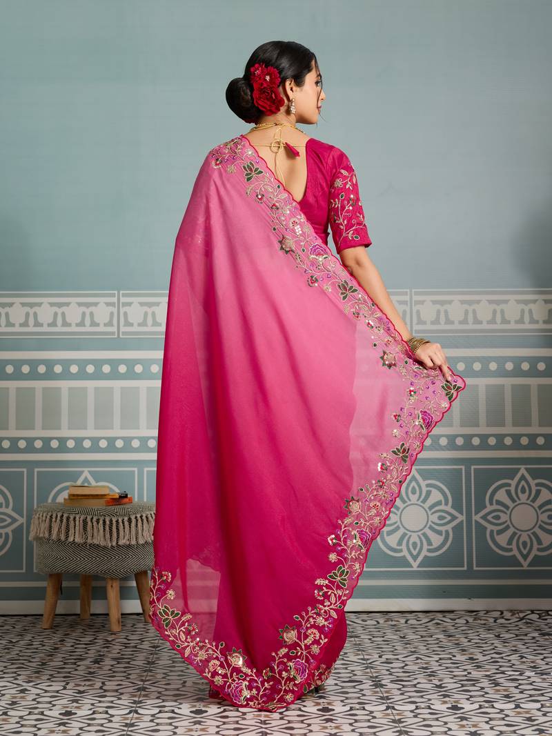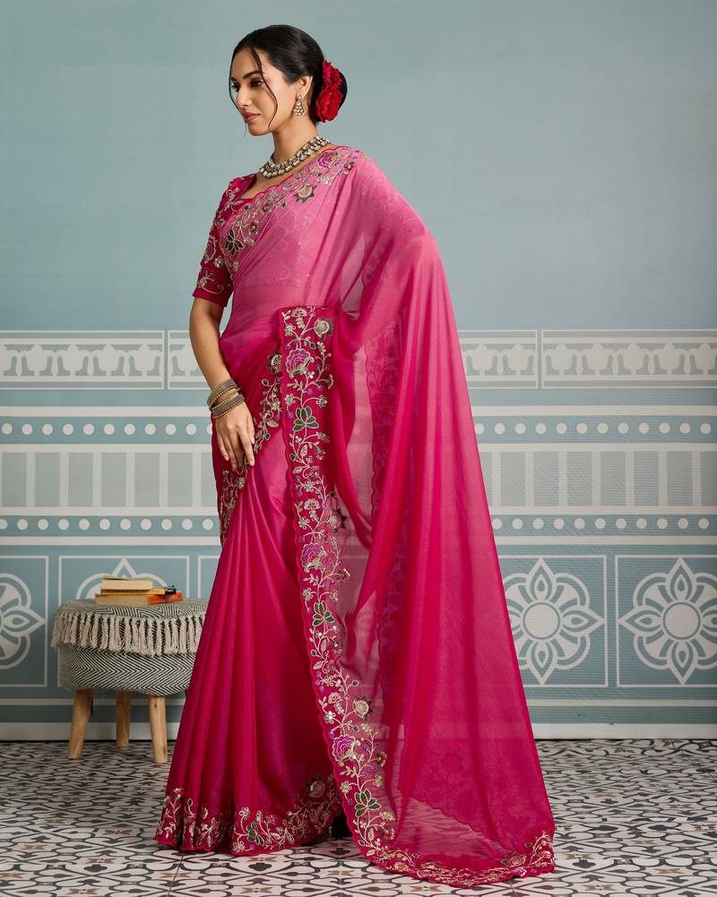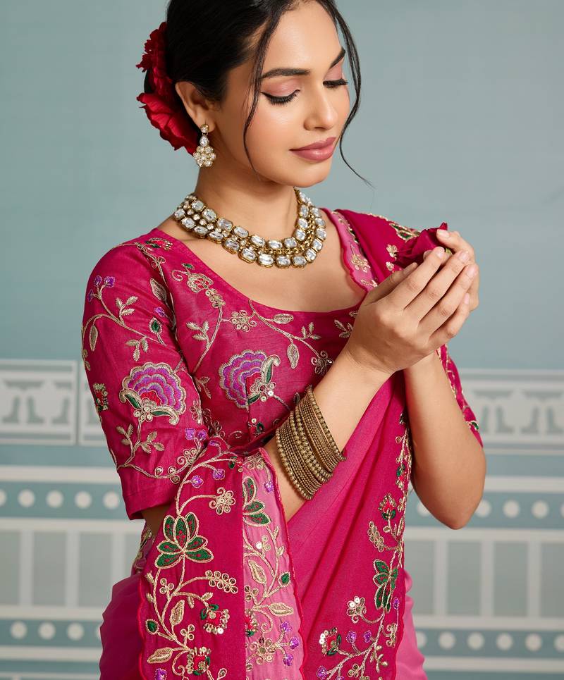 | • | Saree | : | Color- Rani Pink / Fabric- Georgette |