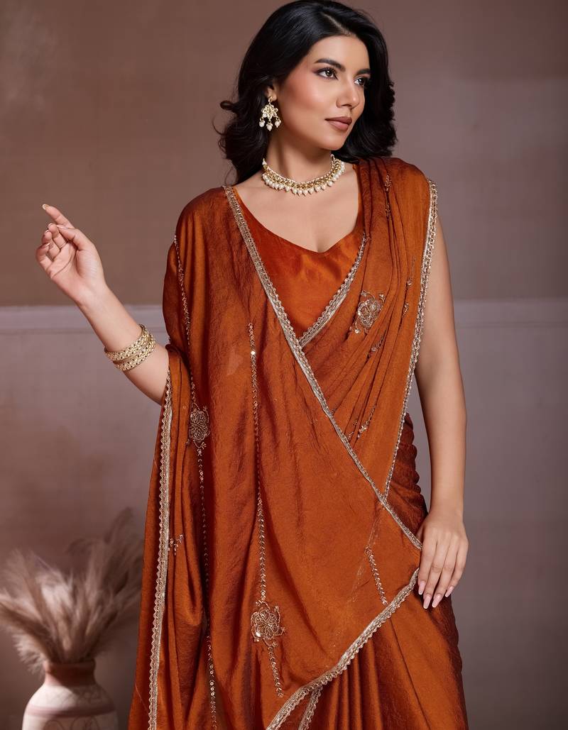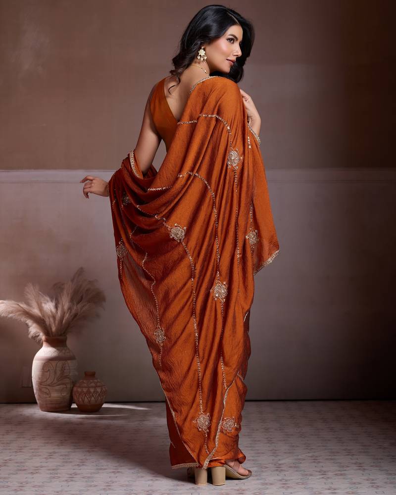 | Product Name | Colorful Rust Orange Crush Silk C Pallu Beads Embroidery Work Saree With Crush Silk Blouse | |