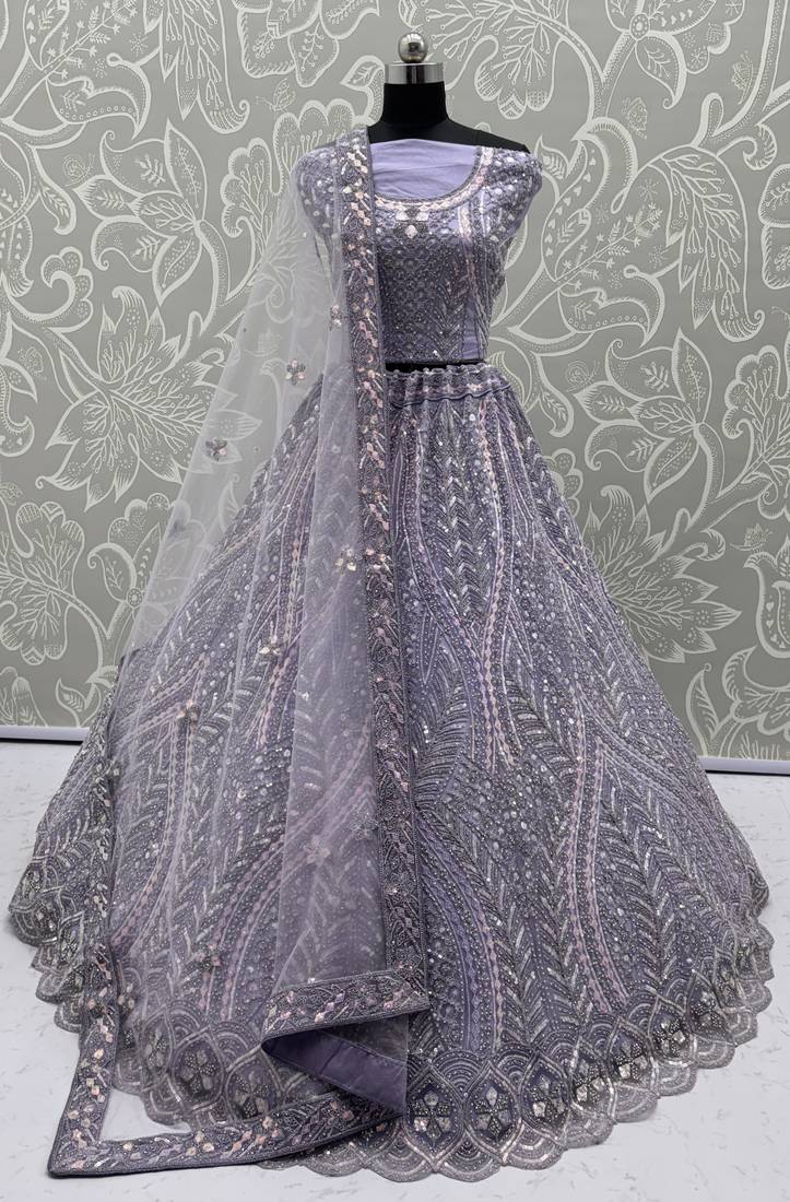 Delightful lilac dori embroidery, zari work, sequence work, thread and motif work heavy net fabric wedding lehenga choli