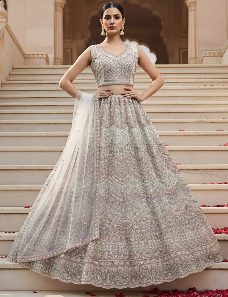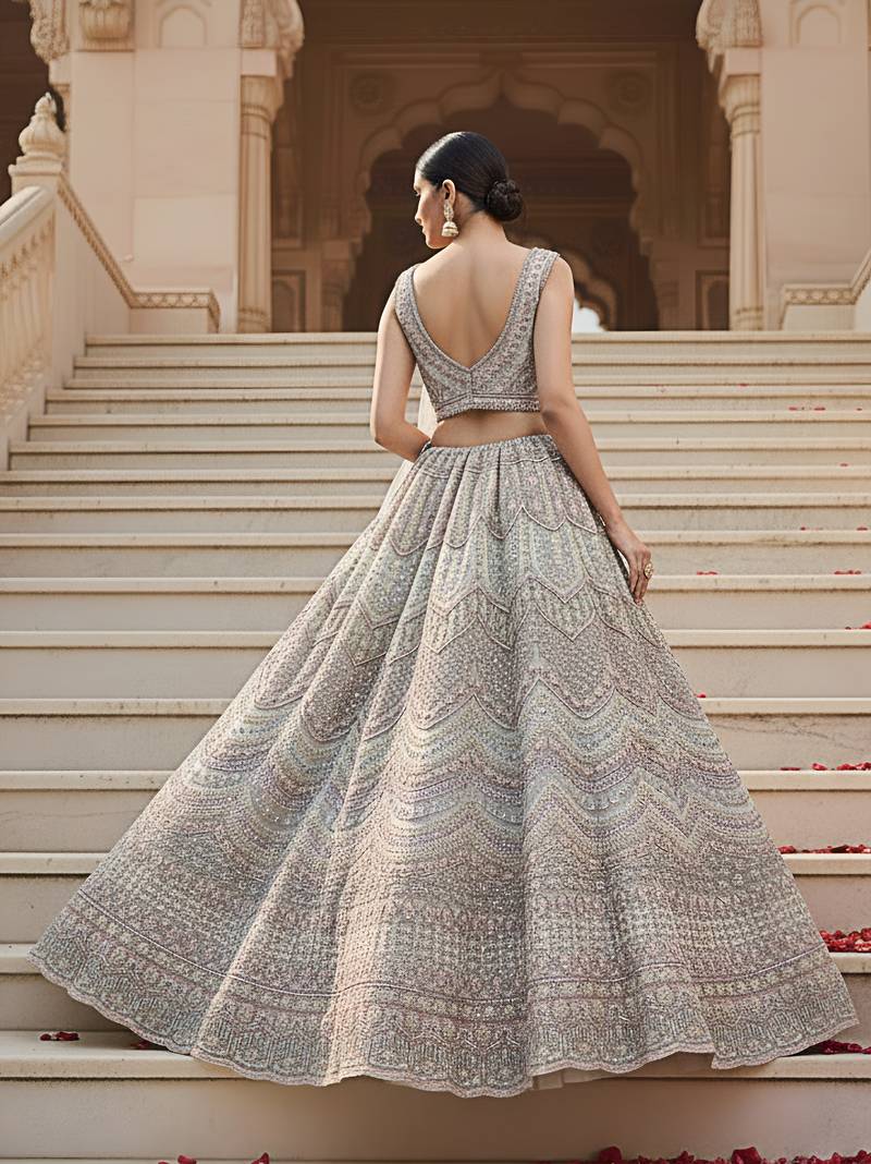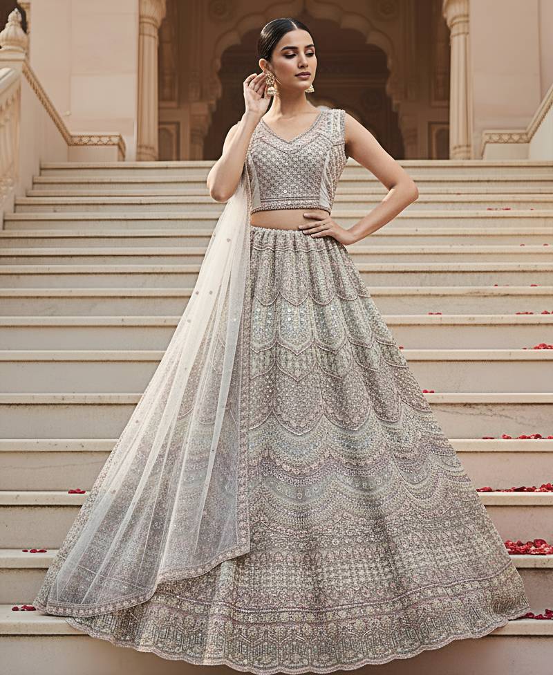 | Product Name | Delightful Off White Handwork Crystal Pipe, Handwork Beads, Sequins And Dori Embroidered Net Lehenga Choli For Wedding | |